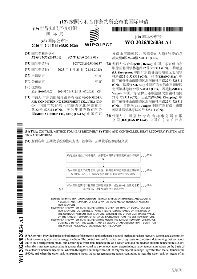 美的集团公布国际专利申请:“热回收系统的控制方法、控制器、热回收系统和存储介质”