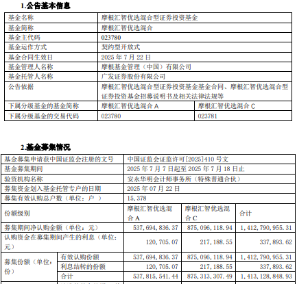 基金募集概况 - 摩根汇智优选混合型证券投资基金合同生效,募集期间净认购金额为1,412,790,955.31元,认购资金在募集期间产生利息337,893.62元,募集份额合计1,413,128,848.93份 [1] - 基金募集期间为2025年7月7日至2025年7月18日,募集有效认购总户数为15,378户,募集资金于2025年7月22日划入基金托管专户 [3] - 基金A类份额募集期间净认购金额为537,694,836.37元,C类份额为875,096,118.94元,合计净认购金额为1,412,790,955.31元 [3] 基金经理信息 - 基金经理胡迪现任指数及量化投资部总监,拥有美林证券、标准普尔及中国国际金融股份有限公司等机构的从业经验,自2020年5月加入摩根基金管理(中国)有限公司 [1] - 胡迪目前管理除指数型基金外的混合与股票型基金,其管理的摩根动态多因子混合A自2021年1月7日至今的任职回报为-5.97% [1] - 基金经理韩秀一曾任中国国际金融股份有限公司资产管理部分析员,自2020年7月加入摩根基金管理(中国)有限公司,现任指数及量化投资部基金经理 [1] 基金历史表现 - 胡迪与韩秀一共同管理的摩根红利优选股票A/C在358天后的任职回报分别为17.66%和16.98%,不及32.64%的同类产品均值水平 [2]