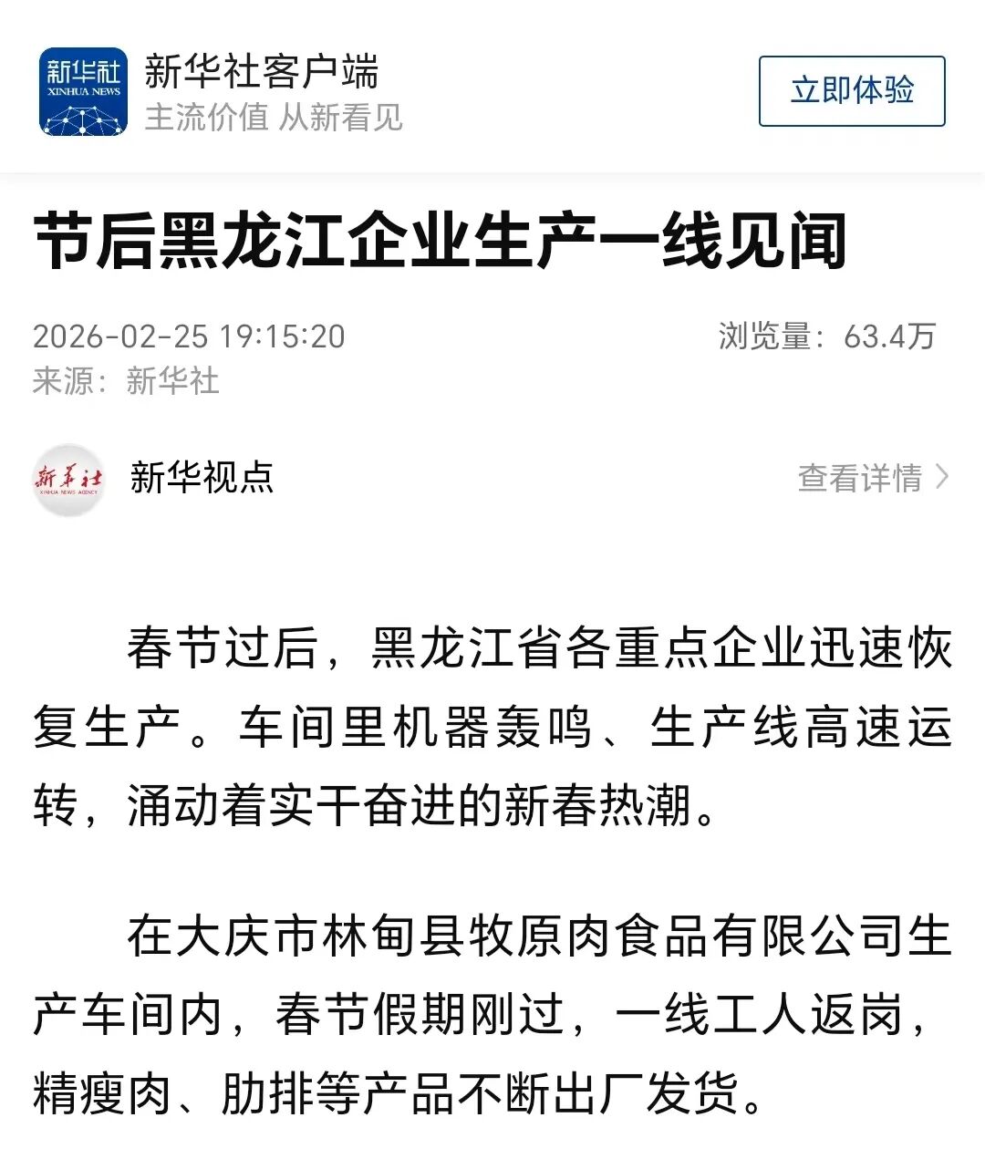 2月25日 新华社刊发 《节后黑龙江企业生产一线见闻》 其中报道了春节过后 大庆各重点企业迅速恢复生产 实干奋进的热潮 原文如下 春节过后,黑龙江省各重点企业迅速恢复生产。车间里机器轰鸣、生产线高速运转,涌动着实干奋进的新春热潮。 在大庆市林甸县牧原肉食品有限公司生产车间内,春节假期刚过,一线工人返岗,精瘦肉、肋排等产品不断出厂发货。 "得益于生产设备的智能化升级改造,2025年全年屠宰生猪212万头,实现产值36亿元,同比增长258%。"公司总经理邵长帅说,今年他们将加大市场开拓 力度,重点向华北等地区发力,力争实现产值再上新台阶。 大庆溢泰 在大庆高新区,国家级专精特新"小巨人"企业——大庆溢泰半导体材料有限公司车间内,70余名身着专业防尘服的技术人员紧盯操控屏幕,监测砷化镓晶 片的各项技术指标。 "我们始终聚焦核心技术攻关,不断提升产品附加值,生产通信等高端领域所需的砷化镓晶片产品。"公司总经理于会永说,产品将供应给国内头部半导体 企业。当前企业订单量同比增长35%,生产排期已到今年8月份,全体员工正争分夺秒赶进度、保交付。 企业稳健发展离不开金融"活水"。在中国农业银行大庆分行营业大厅内,工作人员细致 ...