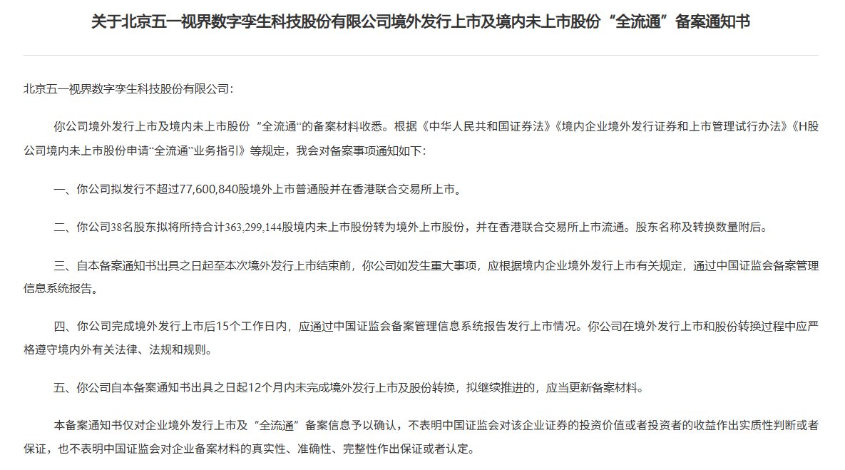 五一视界:赴香港上市获中国证监会备案通知书,中金公司、华泰国际联席保荐