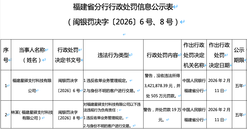 公司受罚事件核心信息 - 新大陆控股子公司星驿支付因违反收单业务管理规定、与身份不明的客户进行交易,被中国人民银行福建省分行处以警告、没收违法所得约342.19万元,并处罚款505万元,合计罚没金额达847.19万元 [2][3] - 相关责任人林某因对上述违法违规行为负有责任,被警告并处罚款19万元 [2][3] - 行政处罚决定日期为2026年2月11日,公示期限为五年 [3] 公司业务与历史背景 - 星驿支付成立于2010年6月,于2016年被新大陆以6.86亿元收购100%股权,是新大陆布局金融科技领域的核心支付牌照 [3] - 星驿支付拥有全国范围展业资质,主要为商户提供数字支付、场景SaaS及数字营销服务 [3] - 根据新大陆财报,2024年星驿支付实现营收25.03亿元,全年支付交易规模超2万亿元,扫码交易占比高达94%,是母公司重要的利润来源 [3] 公司历史合规问题 - 星驿支付业务高速扩张背后合规风险不断累积,近年来多次被罚 [4] - 2025年6月,星驿支付辽宁分公司因违反非金融机构支付服务管理规定被罚没10万余元 [4] - 2024年3月,星驿支付总公司因违反交易信息管理规定被罚180万元 [4] - 2021年,星驿支付曾因12项违法违规行为领到近7000万元的巨额罚单,涉及客户身份识别、可疑交易报告等严重反洗钱漏洞 [4] 行业监管动态 - 第三方支付行业严监管态势持续升级,2026年开年以来已迎来多张大额罚单 [5] - 2026年1月,银盛支付被罚没1584.17万元,开联通支付被罚没3843.49万元 [5] - 恒信通、汇付支付、海科融通、新浪支付等机构均被开出百万元以上罚单 [5] - 据统计,2025年13家支付机构合计被罚没金额超2.12亿元,其中合利宝以7500万元罚单居首 [5]