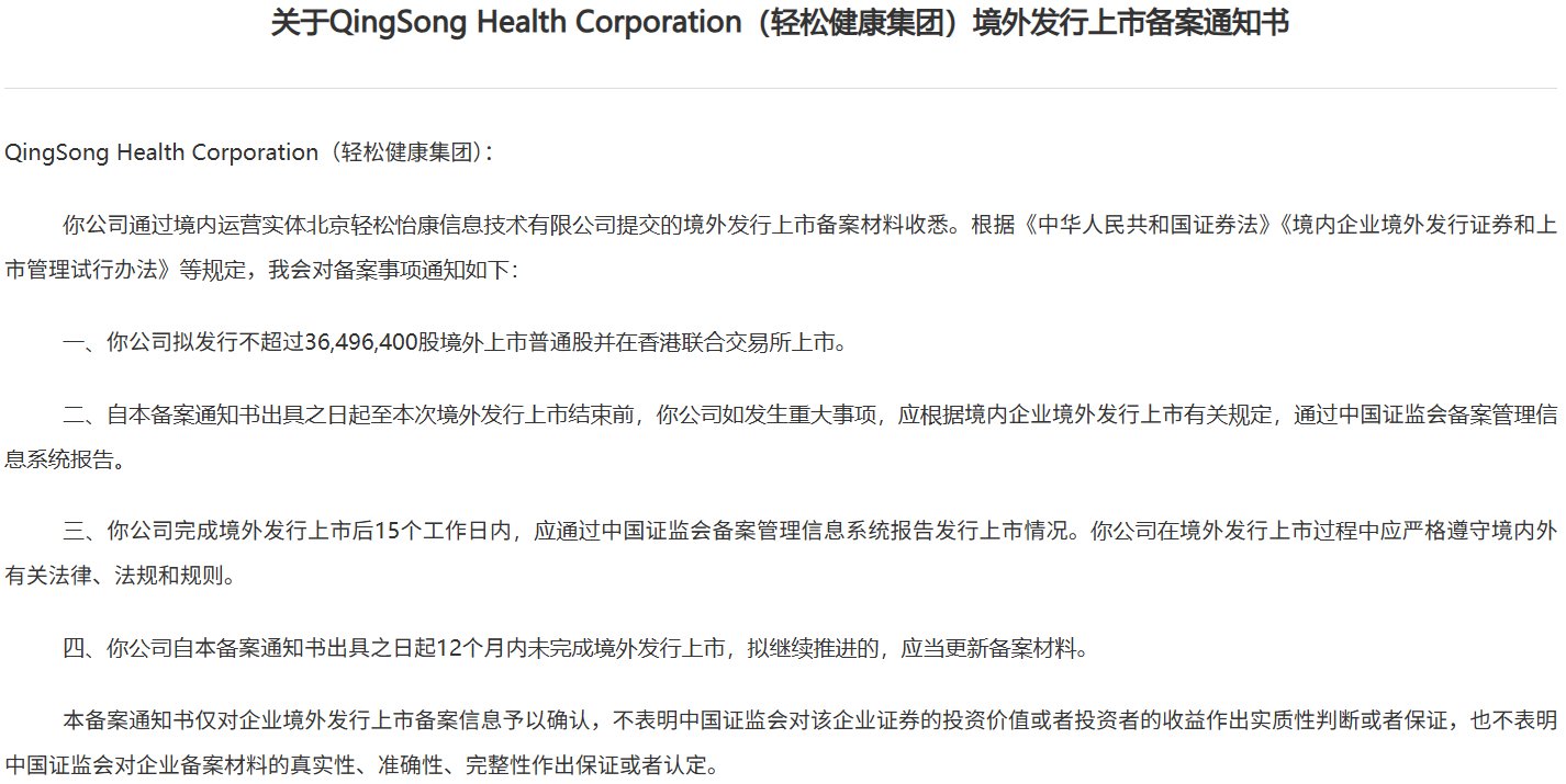 新股消息 | 轻松健康集团港股IPO获中国证监会备案