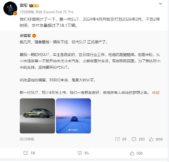 雷军:初代SU7正式停产,不到2年时间交付总量超过38.1万辆