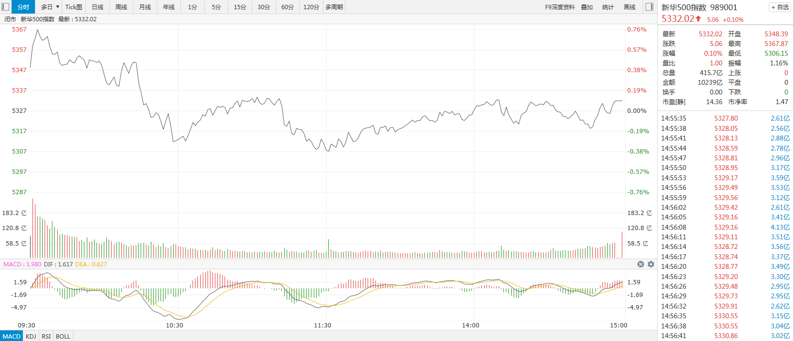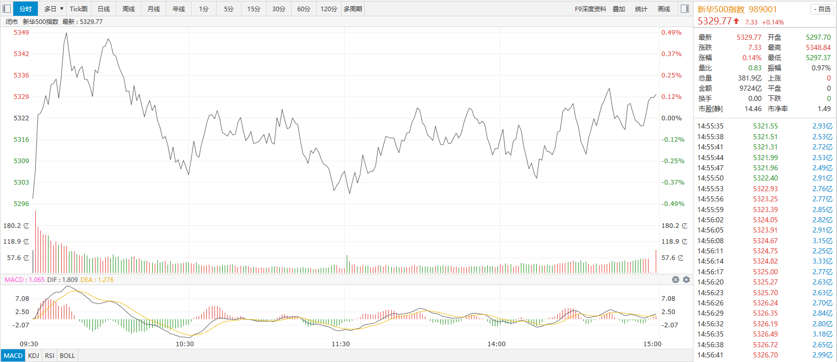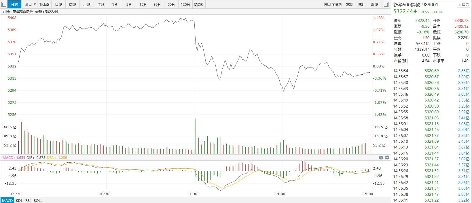 新华财经北京1月15日电新华500指数(989001)1月15日收盘涨0.14%,报5329.77点。 走势上看,新华500指数(989001)15日早间低开后迅速冲高,早盘盘中指数回落翻绿,午后指数宽幅震荡调整,临近收盘时有所反弹,最终小幅收涨。指 数盘中最高触及5348.84点,最低触及5297.37点,成分股全天总成交额报9724亿元,成交额较上一交易日明显减少。 成分股方面,石基信息、紫光国微、环旭电子、通策医疗等成分股涨幅居前;金风科技、中国卫星、中国卫通、华林证券等成分股跌幅靠前。 (文章来源:新华财经) ...