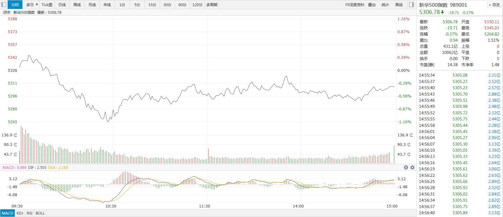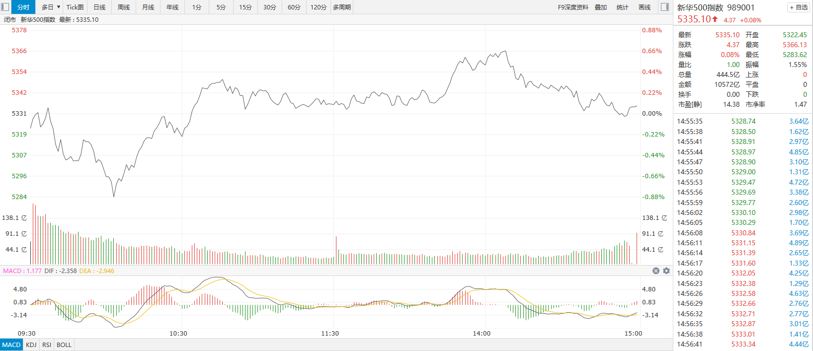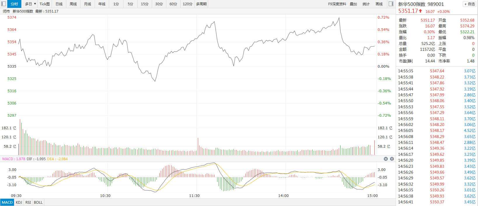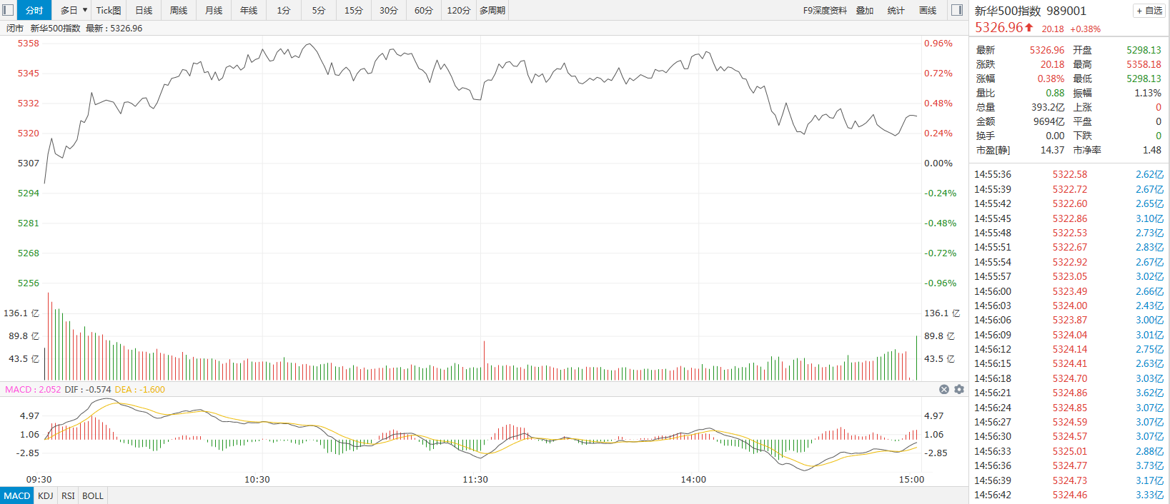 新华财经北京1月15日电新华500指数(989001)1月15日收盘涨0.14%,报5329.77点。 走势上看,新华500指数(989001)15日早间低开后迅速冲高,早盘盘中指数回落翻绿,午后指数宽幅震荡调整,临近收盘时有所反弹,最终小幅收涨。指 数盘中最高触及5348.84点,最低触及5297.37点,成分股全天总成交额报9724亿元,成交额较上一交易日明显减少。 成分股方面,石基信息、紫光国微、环旭电子、通策医疗等成分股涨幅居前;金风科技、中国卫星、中国卫通、华林证券等成分股跌幅靠前。 (文章来源:新华财经) ...