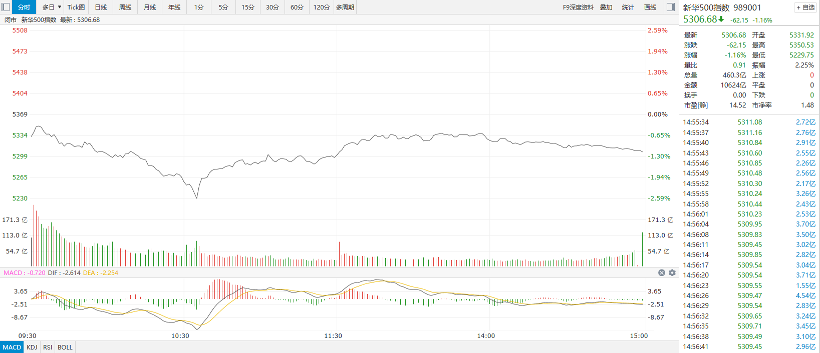 新华500指数1月30日市场表现 - 指数收盘下跌62.15点,跌幅为1.16%,报收于5306.68点 [1] - 指数本周(1月26日至1月30日)累计下跌0.57% [5] 指数日内走势与交易情况 - 指数早间低开,盘初震荡下行,最大跌幅约1.95%,随后波动反弹,午后窄幅整理,最终显著收跌 [3] - 指数全天最高触及5350.53点,最低触及5229.75点 [4] - 成分股全天总成交额为10624亿元,较上一交易日显著缩量 [4] 成分股表现分化 - **涨幅居前个股**:澜起科技上涨12.13%,环旭电子、亨通光电收于约10%涨停,科达制造、泰格医药、中天科技、中际旭创、亿纬锂能等亦有显著上涨 [4] - **跌幅居前个股**:南山铝业、铜陵有色、江西铜业、山东黄金、赤峰黄金、中金黄金、山金国际、中国铝业、盛和资源、洛阳钼业、驰宏锌锗等多股收于约10%跌停 [4] 指数技术指标 - 日线级别移动平均线显示:MA5为5338.50点,MA10为5332.16点,MA20为5325.54点,MA30为5255.29点,MA60为5151.65点,MA120为5046.46点 [6]