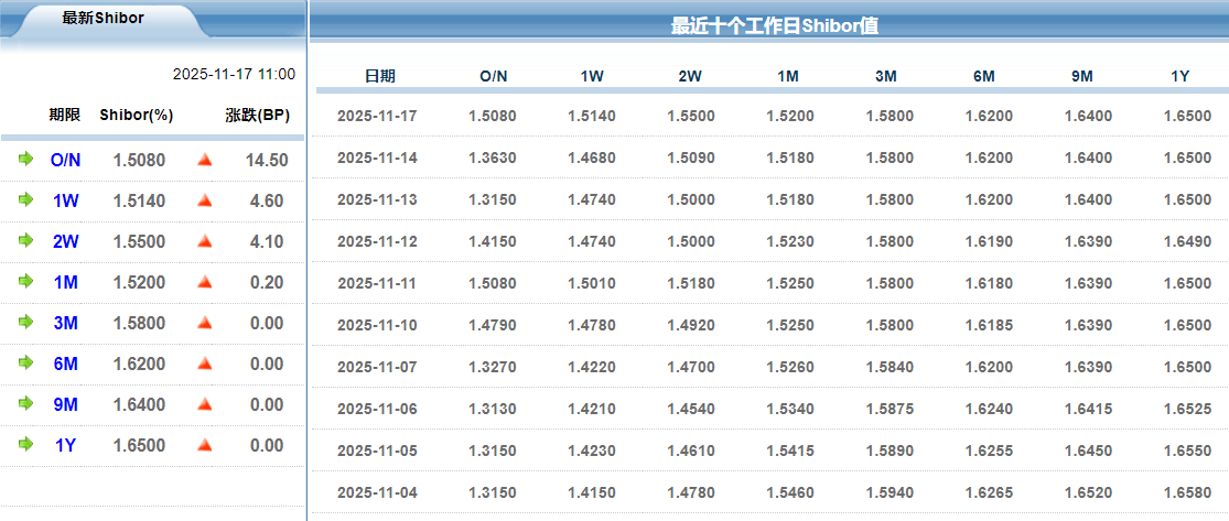 上海银行间同业拆放利率(Shibor)市场动态 - 2025年11月17日,Shibor短端利率全线上行,其中隔夜品种大幅上涨14.5个基点(BP),报收于1.508% [1] - 14天期Shibor报1.550%,高于1个月期Shibor的1.520%,出现期限利率倒挂现象 [1] - 除隔夜品种外,1周期和2周期Shibor也分别上涨4.60BP和4.10BP,而1个月期及以上中长期品种利率保持稳定或微幅变动 [2] 央行公开市场操作 - 为应对流动性变化,央行于11月17日开展8000亿元买断式逆回购操作,操作期限为6个月(182天) [2] - 此次操作采用固定数量、利率招标、多重价位中标方式 [2] 银行体系流动性影响因素 - 10月份5000亿元新型政策性金融工具已投放完毕,带动当月委托贷款规模上升,并将继续推动配套中长期贷款快速投放 [3] - 11月份银行同业存单到期量显著增加,对银行体系流动性构成一定压力 [3] - 以上因素共同导致银行体系流动性收紧,是央行提供流动性支持的主要原因 [3]