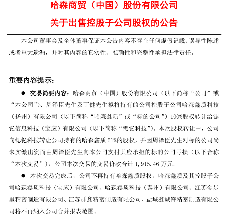 一、监事会会议召开情况 证券代码:603958 证券简称:哈森股份 公告编号:2025-061 哈森商贸(中国)股份有限公司 第五届监事会第十七次会议决议公告 本公司监事会及全体监事保证本公告内容不存在任何虚假记载、误导性陈述或者重大遗漏,并对其内容 的真实性、准确性和完整性承担法律责任。 哈森商贸(中国)股份有限公司(以下简称"公司"或"哈森股份")第五届监事会第十七次会议通知和材 料于2025年10月29日以通讯方式发出,并于2025年11月3日在公司六楼会议室以现场加通讯方式召开。 会议应出席监事3名,实际出席会议监事3名,其中以通讯表决方式出席会议的监事1名。 会议由监事会主席冯利军先生主持,本次会议的召集、召开符合有关法律、行政法规、部门规章、规范 性文件和《公司章程》的规定,表决形成的决议合法、有效。 二、监事会会议审议情况 本次会议审议并通过如下议案: 1、审议通过了《关于出售控股子公司股权的议案》 经监事会审议,监事会认为本次交易公平、合理,没有损害公司和股东的利益;本次出售股权的交易有 利于优化公司资产结构,降低经营风险,实现公司整体资源的优化配置,符合公司和全体股东的利益。 具体内容详见公 ...