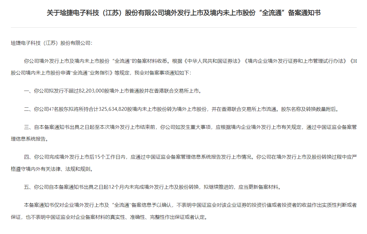 琻捷电子港股IPO及境内未上市股份“全流通”获中国证监会备案