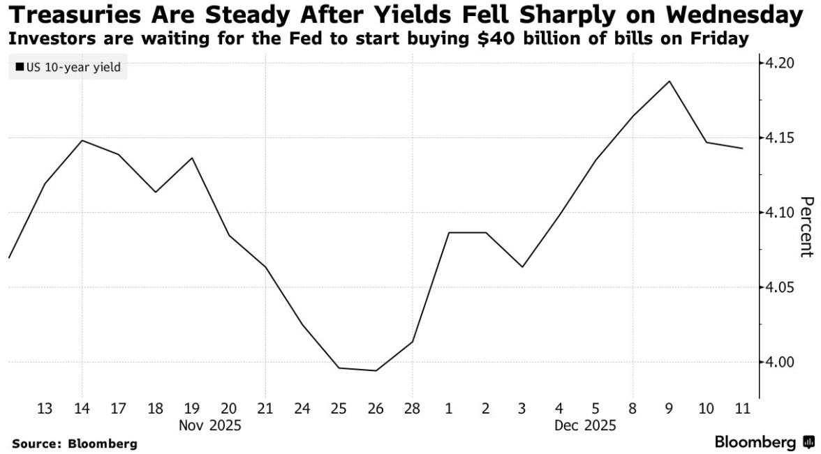 美国国债市场动态 - 美国国债走势在经历三周来最大涨幅后趋稳 投资者正为美联储于周五启动的每月400亿美元国库券购买计划做准备 [1] - 美国10年期国债收益率基本持平于4.14% 两年期国债收益率在创下两个月最大跌幅后亦趋稳定 [1] - 美联储将利率下调25个基点至3.5%-3.75%区间 并宣布启动美债购买以缓解短期融资成本压力 [1] - 杰富瑞集团策略师指出 鉴于美国财政部发行向国库券和短期债券倾斜 美联储的购买操作将产生刺激效果 [1] 市场预期与关键事件 - 货币市场定价显示 市场认为美联储在2026年3月进行首次25个基点降息的可能性为50% 并预期明年累计将有两次降息 [1] - 美国劳工统计局将公布初请失业金人数数据 经济学家预计该数据将从截至12月6日当周的19.1万人升至22万人 [4] - 美国财政部将通过出售220亿美元30年期国债完成本周发债计划 上月同期限国债拍卖曾因尾部利差扩大而推动收益率上行 [4] 其他主要国债市场表现 - 欧元区和英国国债总体持稳 [4] - 日本国债因20年期国债拍卖获得逾五年来最佳需求比率而上涨 较高收益率吸引了投资者 [4] - 澳大利亚国债大幅走高 因11月就业人数意外下降 这可能使该国央行在粘性通胀面前得以延长利率暂停期 [4]