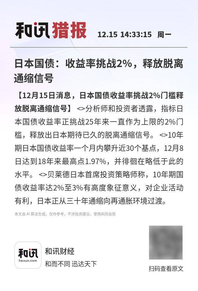 【12月15日消息,日本国债收益率挑战2%门槛释 放脱离通缩信号】 <>分析师和投资者透露,指标日 本国债收益率正挑战25年来一直作为上限的2%门 槛,释放出日本期待已久的脱离通缩信号。 <>10年 期日本国债收益率一个月内攀升近30个基点,12月8 日达到18年来最高点1.97%,并徘徊在略低于此的 水平。 <>贝莱德日本首席投资策略师称,10年期国 债收益率达2%至3%有高度象征意义,对企业活动 有利,目本正从三十年通缩向再通胀环境过渡。 【12月15日消息,日本国债收益率挑战2%门槛释放脱离通缩信号】分析师和投资者透露,指标日本国 债收益率正挑战25年来一直作为上限的2%门槛,释放出日本期待已久的脱离通缩信号。 10年期日本国 债收益率一个月内攀升近30个基点,12月8日达到18年来最高点1.97%,并徘徊在略低于此的水平。 贝 莱德日本首席投资策略师称,10年期国债收益率达2%至3%有高度象征意义,对企业活动有利,日本正 从三十年通缩向再通胀环境过渡。 本文由 AI 算法生成,仅作参考,不涉投资建议,使用风险自担 和讯猎报 12.15 14:33:15 周- 日本国债:收益率挑战2%,释放脱离 通缩信 ...
