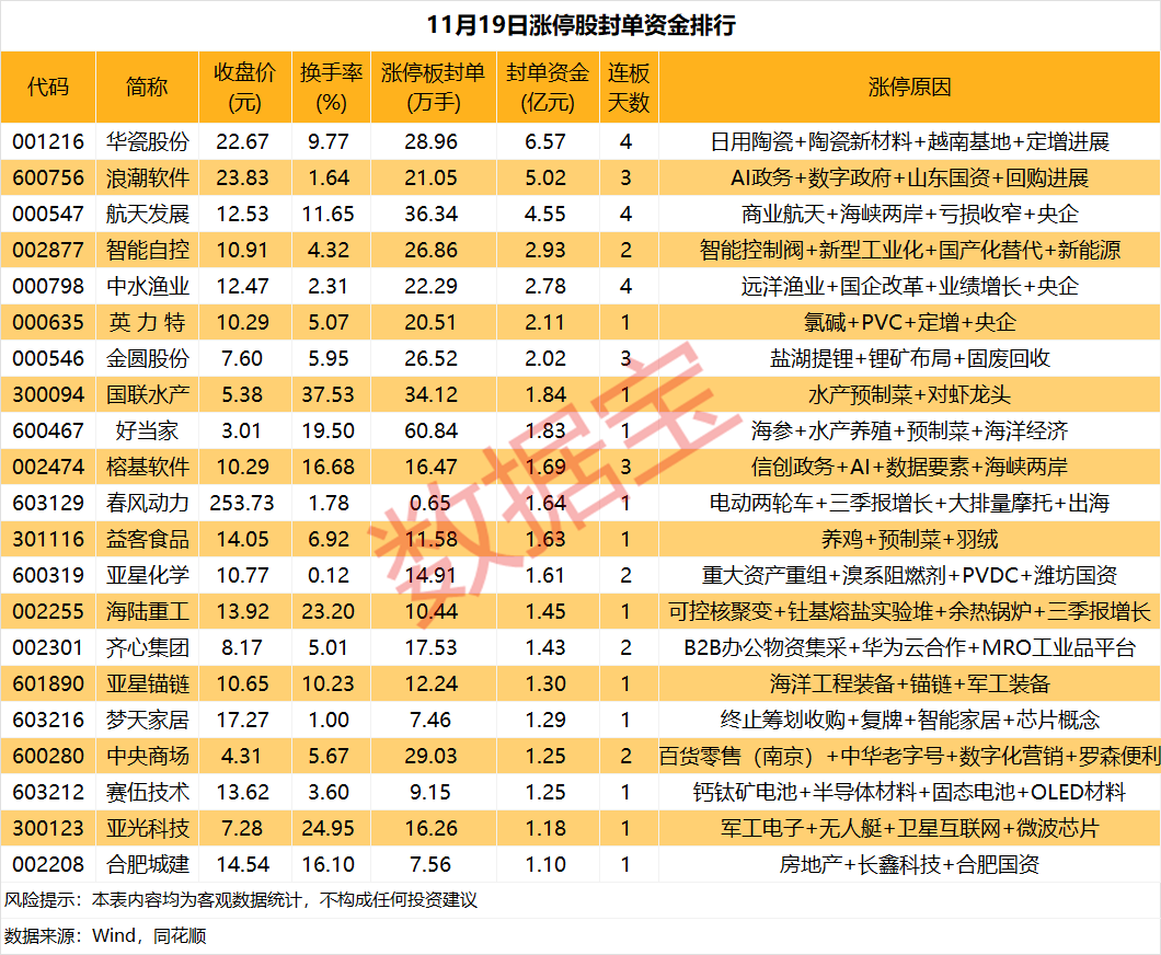 据证券时报·数据宝统计,今日(11月19日),从收盘涨停板封单量来看,好当家、航天发展、国联水产排名前三,依次为60.84万手、36.34万手、 34.12万手;中央商场、华瓷股份、东方海洋、华英农业、智能自控、金圆股份(维权)等股紧随其后,封单量均在25万手以上。 从连续涨停天数来看,九牧王、真爱美家斩获6连板;航天发展、华瓷股份、中水渔业实现4连板;金圆股份、浪潮软件、榕基软件、*ST沐邦(维权) 今日完成3连板。 以封单金额计算,今日21股封单资金超过1亿元。其中,华瓷股份、浪潮软件、航天发展排名前三,金额依次为6.57亿元、5.02亿元、4.55亿元;智能自 控、中水渔业、英力特、金圆股份等股紧随其后,封单金额均在2亿元以上。 华瓷股份斩获4连板,累计涨幅46.35%。公司主要以日用陶瓷的生产和销售为主,越南生产车间已于8月28日正式开工建设,目前正抓紧施工。截至11 月19日收盘,华瓷股份主力资金净流出4996.62万元,净流出额创2025年7月31日以来新高。 今日21股封单资金超过1亿元。 涨停战场:这家公司封单资金逾6亿元 大湖股份:公司依托"两湖两库"优质水域,形成"生态养殖—捕捞—深加工— ...