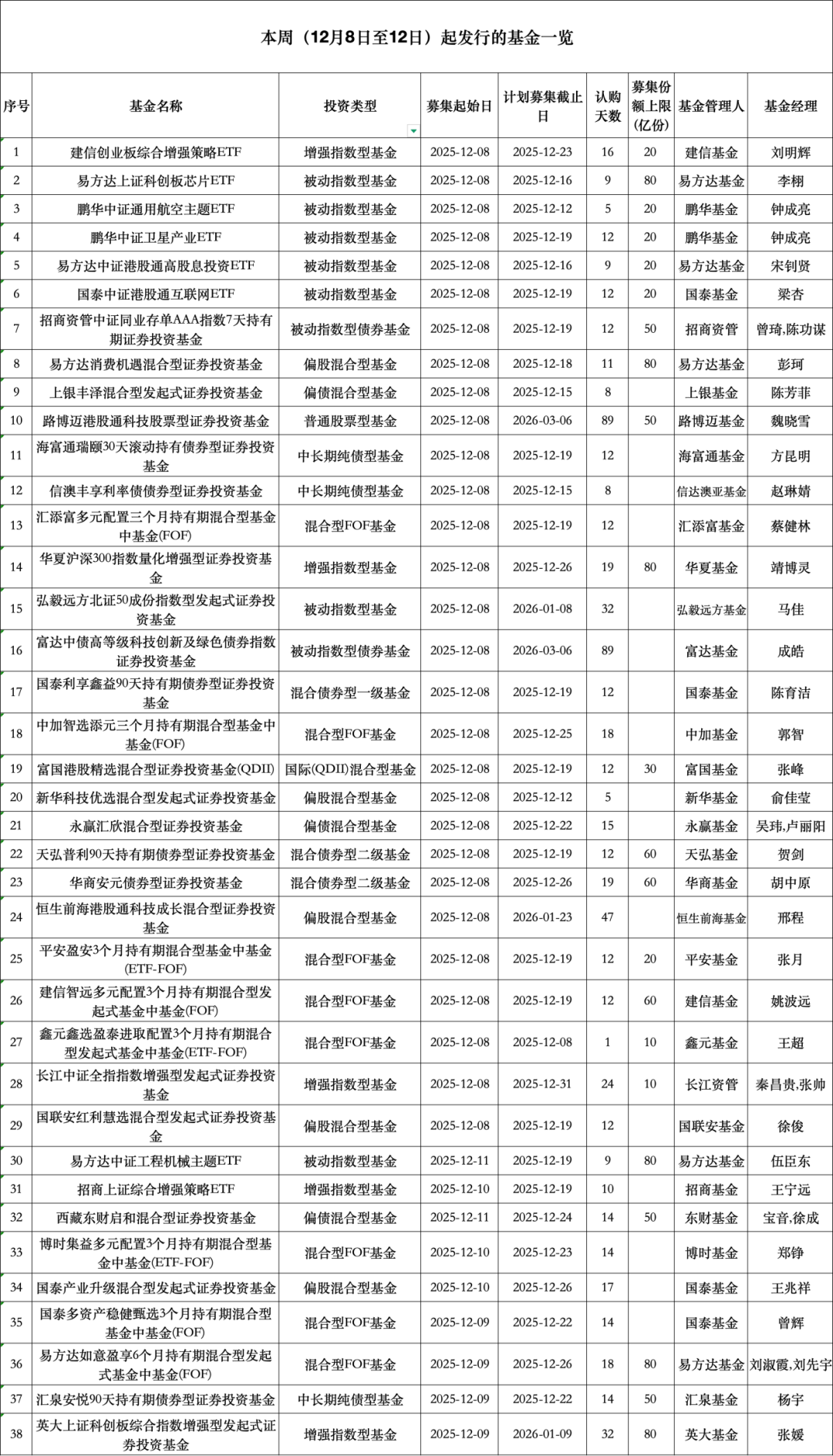 新基金发行概况 - 本周(12月8日—12月12日)全市场共有38只新基金启动公开发行 [1] - 新基金发行高度集中于周一,当天启动发行的基金数量为29只,占本周新基金总数的76.32% [2] - 新基金平均认购天数为18.37天,较三季度末的35天大幅缩短 [3] 基金募集目标与认购期限 - 在38只新基金中,有22只公布了募集目标 [4] - 募集目标最高为80亿份,涉及多只产品,包括易方达中证工程机械主题ETF、易方达上证科创板芯片ETF、华夏沪深300指数量化增强型证券投资基金及英大上证科创板综合指数增强型发起式证券投资基金 [4] - 募集目标最低为10亿份,涉及鑫元鑫选盈泰进取配置3个月持有期混合型发起式基金中基金(ETF-FOF)及长江中证全指指数增强型发起式证券投资基金 [4] - 认购天数最长的基金为89天,涉及路博迈港股通科技股票型证券投资基金和富达中债高等级科技创新及绿色债券指数证券投资基金 [2] - 认购天数最短的基金为1天,为鑫元鑫选盈泰进取配置3个月持有期混合型发起式基金中基金(ETF-FOF) [4] 基金类型分布 - 指数基金是本周新基金发行的“主力军”,共有12只,占本周新基金总数的33.33% [5] - 指数基金中,被动指数型基金有7只,增强指数型基金有5只 [5] - 除指数基金外,本周还有8只混合型FOF和7只主动权益型基金密集发售 [6] 市场动态与政策背景 - 当前新基金发行市场明显好转,权益基金布局明显升温,发行难度有所降低 [6] - 从11月整月看,权益基金和债券基金发行份额环比均有所上升,其中权益基金是发行“主力军” [6] - 政策面上,中国证监会近期优化了ETF注册及上市审核流程,取消了ETF注册环节提交证券交易所无异议函的要求,沪深交易所也相应修改了自律规则,以减轻行业负担并激发市场活力 [6]