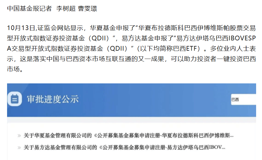 10月13日,证监会公布了最新一批申报的新基金名单,华夏基金和易方达基金旗下的创新产品赫然在列。 根据审批进度公示,华夏基金申报了华夏布拉德斯科巴西伊博维斯帕股票交易型开放式指数证券投资基金(QDII),易方达基金则申报了易方达伊塔乌巴 西IBOVESPA交易型开放式指数证券投资基金(QDII)。 据了解,巴西资本市场是拉丁美洲规模最大、最具影响力的金融体系核心。作为关键的新兴市场代表,巴西资本市场既为全球投资者提供了分享其资源红利 和经济增长潜力的机会,也深刻受到国内财政政策、利率周期以及政治生态的影响,展现出高成长性与高波动性并存的特质。 公开资料显示,伊博维斯帕(Ibovespa)是巴西乃至拉丁美洲最具代表性的股票指数,指数成分股主要由淡水河谷、巴西石油等全球大宗商品巨头构成,覆 盖了巴西在国际上具有比较优势的矿业和农业等产业,金融和能源行业的权重比较高。过去十年,该指数年化收益率超过12%,截至9月末,今年以来收益 率为21.6%。其表现不仅反映了巴西国内的政治经济改革与利率周期,也敏锐地捕捉着全球资本流向新兴市场的脉搏。 也正因如此,在不少业内人士看来,这两只巴西ETF的面世,为投资者提供了一键投资 ...