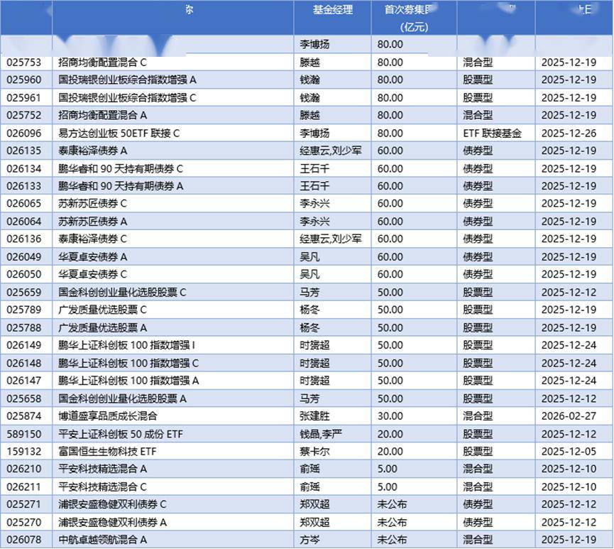 基金发行市场动态 - 12月首周新基金发行密集,共有40只新基金扎堆上市,仅12月1日当天就有28只同时开售 [1] - 多家大型基金公司参与发行,包括永赢、财通、招商、广发等,其明星基金经理也纷纷出马 [1] - 新发基金类型多样,包括被动指数型、偏股混合型、混合债券型二级、增强指数型、FOF等 [2] - 部分新设基金设有募集份额上限,例如易方达创业板50ETF联接A上限为80亿份,鹏华睿和90天持有A上限为60亿份,鹏华上证科创板100指数增强A上限为50亿份 [2] - 基金托管人涵盖各大商业银行及部分券商,如交通银行、招商银行、中国工商银行、中国银行等 [2] 近期新成立基金概况 - 在11月24日至11月28日当周,共有36只新基金成立 [11] - 新成立基金募集规模差异显著,最高为汇添富稳颐优选A,募集24.99亿份,最低为中金恒宁A,仅募集0.10亿份 [11] - 基金认购天数从最短1天到最长71天不等,显示市场认购热度分化 [11] - 成立基金的投资类型以被动指数型、混合债券型二级和偏股混合型为主 [11] - 部分基金聚焦于特定主题或指数,如红利低波动、港股通、科技成长、电网设备、科创板等 [11] 市场行为与投资者认知 - 历史经验表明,在牛市行情中,多数普通投资者难以将账面盈利转化为实际收益,往往经历“过山车”行情 [3] - 普通投资者常因人性弱点(盈利时怕回吐、亏损时不舍割肉)而做出非理性决策,导致赚小钱、亏大钱 [6] - 股价波动背后存在机构资金的有意图行为,例如“游资抢筹”和“机构震仓” [8] - 普通投资者因无法洞察资金真实意图,往往在机构洗盘时被震出局,拿不住优质股票 [8] - 量化分析能够将资金博弈行为转化为可视化的交易信号,辅助投资者识别“震仓”后的“抢筹”机会 [10] 投资策略与市场启示 - 通过量化策略把握从“机构震仓”到“游资抢筹”间的机会,在案例股票的五次操作中实现了累计63.36%的收益,效率接近全程持有 [10] - 年底基金密集发行并重点布局科技、消费、人工智能等领域,与近期市场主线吻合,表明专业机构正在捕捉相关机会 [10] - 对于普通投资者而言,理解资金真实动向比单纯追逐热点股票或新基金更为重要 [11] - 改变看待市场的方式,利用量化数据洞察资金行为,是打破“牛市不赚钱”困境的关键 [12]