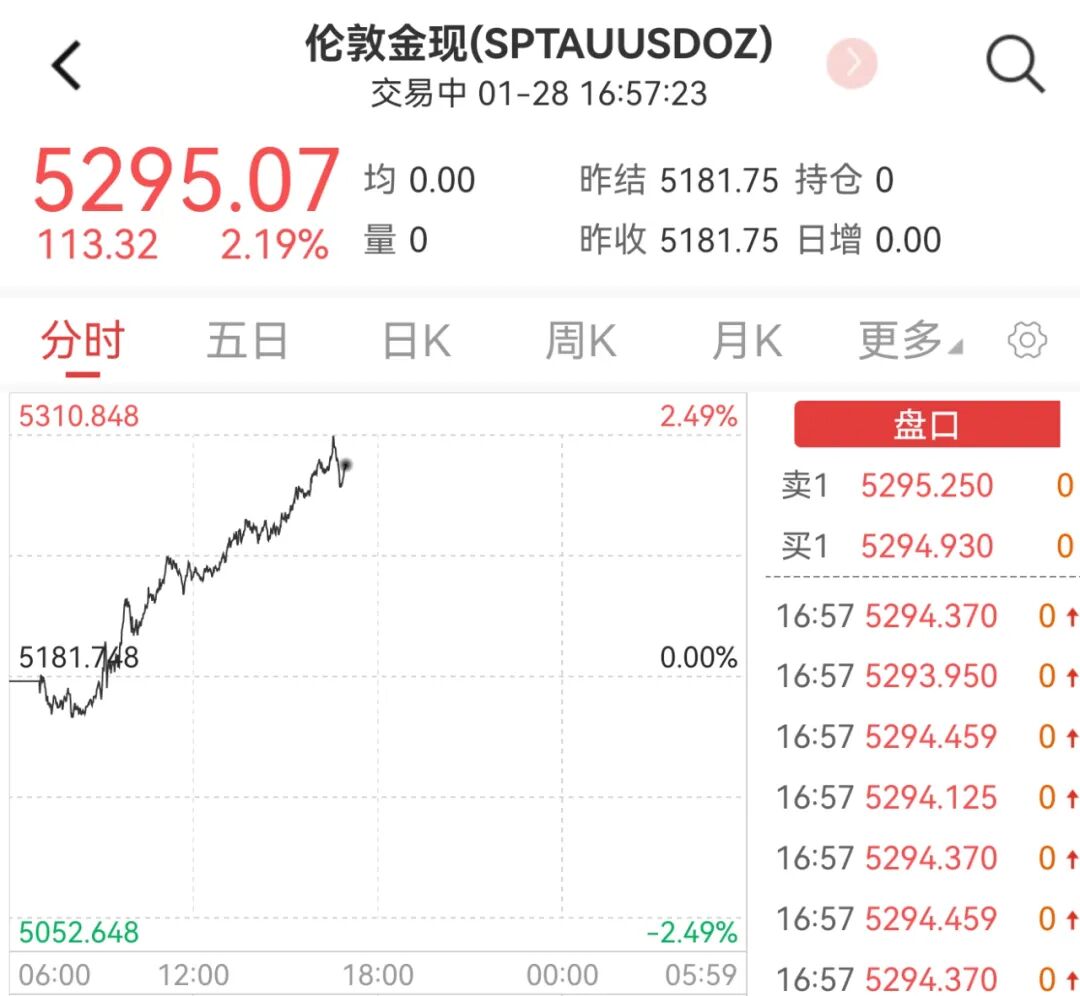 炒股就看金麒麟分析师研报,权威,专业,及时,全面,助您挖掘潜力主题机会! 来源:国际金融报 金价再迎"暴走"行情。 1月28日,国际黄金市场全线走强,盘中一度突破5300美元/盎司。与此同时,公募黄金产品已启动风控 措施,易方达黄金主题LOF宣布自今日起暂停申购。 受访人士认为,支撑金价的结构性因素尚未改变:美国财政债务持续扩张、美元中长期走弱、地缘政治 不确定性及全球央行购金等逻辑依然稳固。展望后市,多家机构已上调黄金目标价,维持看好态度。不 过,考虑到当前金价已处于历史高位且短期涨幅剧烈,投资者仍需警惕相关产品的溢价风险。 金价再创新高 1月28日,国际金价持续攀升,连续刷新历史纪录。伦敦金现先破5200美元/盎司整数关口,盘中再破 5300美元/盎司大关。截至发稿,伦敦金现日内大涨2%,报5285.485美元/盎司,盘中最高触及5311.58美 元/盎司。 | 伦敦金现 | | | SPTAUUSDOZ | | --- | --- | --- | --- | | 5285.485 | | | +103.737 +2.00% | | IDC USD 16:45:31 | | | 8 | | 定 | 528 ...