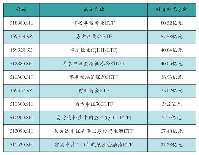 市场概况 - 10月27日两市ETF两融余额为1176.26亿元,较前一交易日减少2.95亿元 [1] - 融资余额为1094.77亿元,较前一交易日减少3.95亿元;融券余额为81.5亿元,较前一交易日增加1.0亿元 [1] - 沪市ETF两融余额为819.77亿元,减少2.48亿元;深市ETF两融余额为356.49亿元,减少4680.42万元 [1] ETF融资融券余额排名 - 华安易富黄金ETF以80.52亿元的融资融券余额位居首位 [2] - 易方达黄金ETF和华夏恒生(QDII-ETF)分别以57.58亿元和40.84亿元的余额位列第二、三位 [2] - 前十大ETF中,黄金、港股及券商主题ETF占据主导地位 [2] ETF融资买入额排名 - 易方达中证香港证券投资主题ETF融资买入额最高,达34.48亿元 [3][4] - 华泰柏瑞南方东英恒生科技指数(QDII-ETF)和海富通中证短融ETF融资买入额分别为12.44亿元和11.42亿元 [3][4] - 融资买入活跃的ETF主要集中在港股科技、短融债券及科创板等主题 [4] ETF融资净买入额排名 - 广发中证香港创新药(QDII-ETF)融资净买入额最高,为7379.09万元 [5][6] - 国泰中证全指证券公司ETF和华宝中证全指证券公司ETF融资净买入额分别为6690.85万元和6625.55万元 [5][6] - 融资资金净流入方向包括香港创新药、证券公司、纳斯达克指数及动漫游戏等主题 [6] ETF融券卖出额排名 - 南方中证500ETF融券卖出额最高,为7143.43万元 [7][8] - 华泰柏瑞沪深300ETF和南方中证1000ETF融券卖出额分别为2852.21万元和1836.45万元 [7][8] - 融券卖出活动主要集中于宽基指数ETF,如中证500、沪深300等 [8]