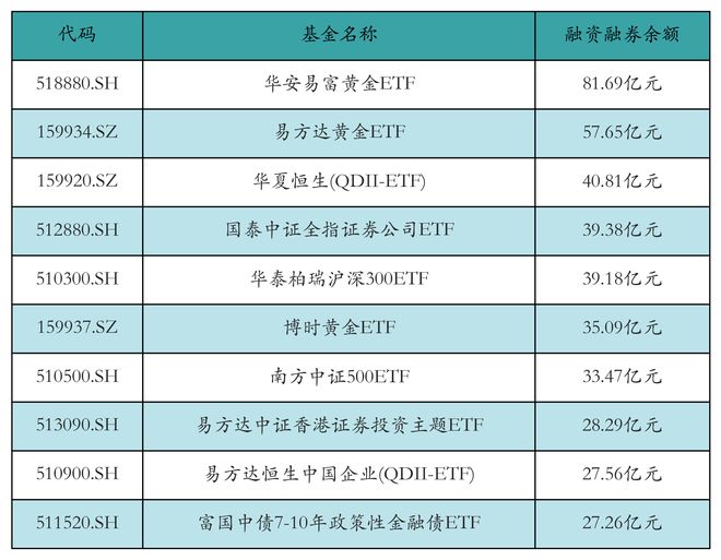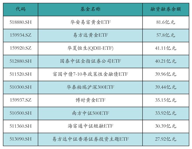 市场概况 - 10月31日两市ETF两融余额为1189.32亿元,较前一交易日增加6.48亿元,其中融资余额增加9.35亿元至1109.85亿元,融券余额减少2.87亿元至79.47亿元 [1] - 沪市ETF两融余额增加9.31亿元至833.93亿元,融资余额增加11.96亿元至764.04亿元,融券余额减少2.65亿元至69.89亿元 [1] - 深市ETF两融余额减少2.83亿元至355.39亿元,融资余额减少2.6亿元至345.81亿元,融券余额减少2231.96万元至9.58亿元 [1] ETF两融余额排名 - 华安易富黄金ETF以81.13亿元的余额位居市场首位,易方达黄金ETF和华夏恒生(QDII-ETF)分别以56.9亿元和41.16亿元的余额位列第二和第三 [2][3] - 两融余额前十的ETF还包括华泰柏瑞沪深300ETF、国泰中证全指证券公司ETF、博时黄金ETF等主流宽基和行业主题产品 [3] ETF融资买入额排名 - 海富通中证短融ETF融资买入额最高,达20.59亿元,易方达中证香港证券投资主题ETF和博时中证可转债及可交换债券ETF紧随其后,融资买入额分别为16.61亿元和9.92亿元 [4] - 融资买入活跃的ETF涵盖短融、港股证券、可转债、恒生科技、纳斯达克100等多个细分领域,显示融资资金偏好多元化配置 [4] ETF融资净买入额排名 - 海富通中证短融ETF融资净买入额居首,为2.85亿元,华泰柏瑞沪深300ETF和易方达创业板ETF的融资净买入额分别为1.42亿元和1.19亿元 [5] - 融资资金呈现向短融ETF、沪深300ETF、创业板ETF等稳健型或代表性宽基产品净流入的态势 [5] ETF融券卖出额排名 - 国泰CES半导体芯片行业ETF融券卖出额最高,为1988.33万元,华泰柏瑞沪深300ETF和南方中证申万有色金属ETF的融券卖出额分别为1979.35万元和403.23万元 [6] - 融券卖出活动主要集中在半导体芯片、沪深300、有色金属、中证1000等波动性较大的行业或宽基指数ETF上 [6]