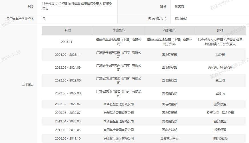每经记者|任飞 每经编辑|叶峰 1月29日,中国基金业协会公布了最新私募基金管理人名单,结果显示,前朱雀基金固收投资总监、后转任广发资管固收部 总经理的柳雯青创办了恒熵私募基金管理(上海)有限公司,在1月27日登记备案,该证券私募机构由她本人全额出资。 1月29日,银华基金发布公告,旗下基金经理李晓彬在1月27日卸任了其管理的所有产品;公司旗下另一位基金经理刘辉也于 近期清仓式卸任了所有在管产品,刘辉在1月9日卸任了其管理的多只权益类基金。 柳雯青独资创办私募公司 1月29日,中国基金业协会公布了最新的私募基金管理人名单,前朱雀基金固收投资总监、后转任广发资管固收部总经理的 柳雯青创办了恒熵私募基金管理(上海)有限公司,在1月27日登记备案,该证券私募机构由她本人全额出资。 | 酿苦 | 法定代表人 总经理 执行审事 信息填报负责人 投资负 盖人 | | 姓名 柳青 | | | --- | --- | --- | --- | --- | | 是否有基金从业资格 | 是 | | 贸格获取方式 通过考试 | | | | 时间 | 任职单位 | 任职部门 | 調 | | | 2025.11 - | 公路中(奥士)開 ...