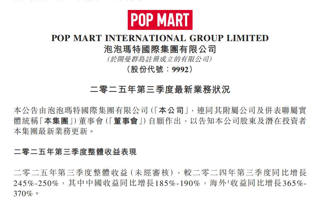 财务表现 - 公司第三季度收入同比增长245%至250%,增速较上半年的204%和首季的170%进一步加快 [1] - 中国市场第三季度增长185%至190%,较上半年的135%显著提速,主要由于供应状况改善 [1] - 海外市场第三季度增长365%至370%,较上半年的440%有所放缓,其中欧洲和美洲销售表现依然强劲,分别增长735%至740%及1265%至1270% [1] 业务驱动因素 - 中国市场强劲表现主要受到在线销售渠道驱动 [1] - LABUBU在谷歌搜寻趋势虽趋向正常,但仍与一些长青IP表现相若 [1] 增长前景与战略 - 公司作为IP平台,合作可扩张至珠宝及积木等领域 [1] - 新兴IP如星星人及叛桃朋克正在崛起 [1] - 公司尝试发展动画等多元化内容 [1]
