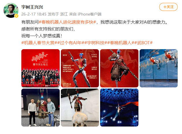 公司动态 - 宇树科技创始人王兴兴通过微博平台就春晚机器人话题与公众互动 回应了关于机器人进化速度的询问 并指出其速度取决于大众对人工智能的想象力 [1] 行业观点 - 机器人技术进步与人工智能的发展前景紧密相关 其进化速度被视为一个开放性的、受公众认知和预期影响的过程 [1]