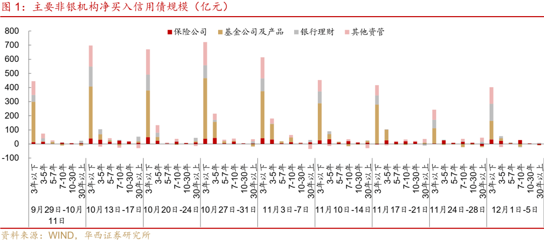 市场整体表现与情绪 - 12月1日至5日,资金面平稳,但央行买债不及预期,市场对进一步“宽货币”预期弱化,债市继续调整 [1][4] - 信用债收益率普遍上行,其中城投债10-15年超长债收益率上行6-8bp,1-5年上行幅度在5bp以内 [4][22] - 临近年尾,债市未出现抢跑行情,基金等主要交易盘冲刺动力不足,近两周基金净买入信用债规模分别为63.3亿元和130.9亿元,相比10月至11月中上旬平均400亿元左右的规模显著下降 [1][4] - 基金对3-10年中长久期信用债保持偏谨慎态度,近两周合计净卖出30亿元 [1][4] - 配置盘需求也偏弱,保险最近三周平均净买入信用债64.2亿元,而10月至11月第二周周度净买入规模均在100亿元以上 [1][5] - 理财12月第一周净买入信用债139.3亿元,环比前周增加57.5亿元,但由于年末回表需求,预计12月第二周开始理财规模将下降,可能导致信用债买盘力量转弱 [1][5] 投资策略与建议 - 建议以中短久期防御性品种为主,保证组合流动性,对高波动、流动性弱的长久期品种维持谨慎 [2][9] - 重点关注1-3年AA(2)及以上信用债,因其具有一定的票息且流动性较好 [2][9] - 从收益率看,1-3年隐含评级AA+信用债中,有9317亿元收益率在2%-2.4%之间;1-3年AA和AA(2)信用债中,有1.7万亿元收益率在2.2%-2.6%之间,占比达28.7% [2][9] - 从流动性看,1-3年AA+、AA和AA(2)信用债成交较为活跃,月度成交笔数占比多在4%-6%之间,优于多数3年以上中长久期品种,且在债市调整阶段流动性不会快速萎缩 [2][12] - 12月封闭期为2-3年的摊余债基打开规模较大,合计1077亿元,其中封闭期36个月、24个月的产品规模分别为572亿元、242亿元,若有部分产品转为信用风格,或提振2-3年左右信用债需求,利于估值稳定 [10][11] 城投债市场 - 12月1日至7日,城投债净融资小幅转负,发行918亿元,到期946亿元,净流出27亿元 [20] - 一级认购情绪略有回落,3倍以上认购数量占比约50%,处于2025年10月以来较低水平 [20] - 发行期限向3年以内集中,3-5年发行占比下降7个百分点至24%,5年以上发行占比仅为1% [20] - 中长端发行利率低位回升,1年以内城投债发行利率较11月下行3bp,而1-3年、3-5年和5年以上分别上行10bp、6bp和65bp [20] - 二级市场长端收益率明显上行,10-15年超长债收益率上行6-8bp,信用利差表现分化,高等级1年、10年城投债利差走扩3-5bp,30年高等级利差被动收窄8-10bp [4][22] - 从经纪商成交数据看,城投债成交笔数较此前下降,各期限成交偏离估值幅度多在1bp之内,短久期下沉表现较好,0.5-1年AA、AA(2)和AA-整体可略低估值成交,而5年以上长期限城投债平均高估值成交幅度较大 [22] 产业债市场 - 12月1日至7日,产业债发行1394亿元,同比增加252亿元,净融资591亿元,同比增加513亿元 [23] - 综合、公用事业净融资规模较大,均在100亿元以上,发行情绪小幅回暖,全场倍数3倍以上占比由15%升至19% [23] - 中长久期发行占比明显下降,1年以内发行占比由11月的29%升至44%,3-5年和5年以上占比则分别由20%、11%降至12%、3% [23] - 发行利率全线上行,中长久期上行幅度更大,1-3年、3-5年、5年以上发行利率分别为2.31%、2.58%、2.50%,较11月上行22-48bp,1年以内发行利率为1.69%,较11月上行3bp [23] - 从经纪商成交看,产业债买盘情绪偏弱,TKN占比由65%下降至63%,成交继续降久期,1年以内、1-2年占比分别由37%、18%升至40%、20% [26][27] - 高评级成交占比回升,AAA-及以上占比环比增加5个百分点至55% [26] 银行二永债市场 - 12月1日至5日,银行二永债(二级资本债和永续债)继续跑输普通信用债,收益率全线上行,中长端表现更弱,3-5年和10年收益率上行4-12bp [3][14][28] - 信用利差普遍走扩,4年、10年二永债利差走扩4-9bp,与中短票相比,银行二永债表现落后,相对利差多走扩,其中3-4年和10年二级资本债、3-4年AA及以上永续债和4-5年AA-永续债调整幅度更大,相对利差走扩4-8bp [3][14] - 二永债具有“利率波动放大器”属性,在利率债方向不明且基金销售费用新规未落地的背景下,估值波动风险较大,交易盘建议谨慎参与 [3][17] - 随着中长久期二永债收益率攀升至年内高点附近,性价比凸显,部分负债端稳定、追求绝对收益的账户可考虑布局,持有体验或好于普通信用债 [3][17] - 假设持有3个月且收益率曲线不变,3-5年大行二永债的持有期收益率高于普通信用债,尤其是3年品种,持有收益率要高10bp左右,即使后续估值调整,3年大行二永债也能承受约20bp的利率上行风险 [17][18] - 从经纪商成交看,12月1日至5日银行二永债成交情绪较弱,二级资本债、永续债TKN占比分别为56%、52%,低估值占比均环比减少3个百分点 [31] - 国有行成交降久期,二级资本债、永续债4-5年成交占比分别环比下降5、9个百分点,股份行成交则小幅拉久期,二级资本债5年以上成交占比环比增加5个百分点 [31] - 城商行成交情绪也较弱,二级资本债、永续债低估值占比分别下降8、11个百分点,城商行永续债成交降久期并向低等级扩散 [31]