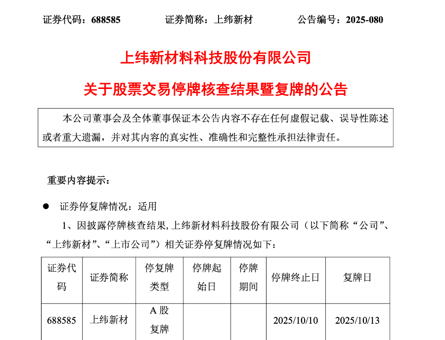 炒股就看金麒麟分析师研报,权威,专业,及时,全面,助您挖掘潜力主题机会! 20倍大牛股下周一复牌,控股股东否认赴港IPO 记者丨邓浩 20倍大牛股上纬新材,昨日(10月10日)晚间公告停牌核查结果,宣布拟下周一(10月13日)复牌。 此前智元机器人收购上纬新材股权,一度被市场视为"要搞资产整合"。此次上纬新材在公告重申,收购 方未来十二个月内不存在资产重组计划。未来36个月内,智元创新不存在通过上市公司借壳上市的计划 或安排。 此外,同样在昨日,有市场传言称,智元机器人计划明年在香港上市,已聘请中金公司、中信证券和摩 根士丹利负责其股票发行事宜,目标估值为51亿至64亿美元。10月11日,智元机器人相关负责人对记者 澄清此为不实信息。 | 证券代 | 证券简称 | 停复牌 | 停牌起 | 停牌 | 停牌终止日 | 氢牌日 | | --- | --- | --- | --- | --- | --- | --- | | 码 | | 类型 | 始日 | 期间 | | | | 688585 | 上纬新材 | A 股 | | | 2025/10/10 | 2025/10/13 | | | | 复牌 | | | | | ...