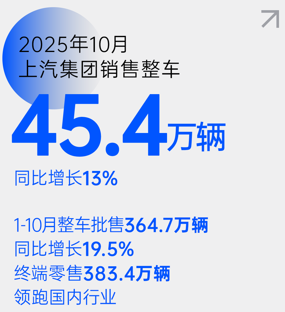 公司整体销量表现 - 10月份公司销售整车45.4万辆,同比增长13%,实现月销量同比“十连涨” [1] - 1—10月累计批售364.7万辆,同比增长19.5%,终端零售383.4万辆,领跑国内行业 [1] 自主品牌业务 - 10月份自主品牌销量达30.6万辆,同比增长22% [1] - 1—10月自主品牌累计销量235万辆,同比增长28.3%,占公司总销量比重达64.4%,较去年同期提升4.4个百分点 [1] - 10月份上汽乘用车销售9.3万辆,同比增长25.1%,其中国内市场销量大幅增长234.4% [1] - 10月份上汽大通销售近2万辆,同比增长47.9% [1] - 10月份上汽通用五菱销售16.8万辆,同比增长19.5% [1] 新能源汽车业务 - 10月份新能源车销售20.7万辆,继9月后再创历史新高,同比增长31.6% [2] - 1—10月新能源车累计销售129万辆,同比增长42.5% [1][2] - 10月份智己汽车销售1.3万辆,同比增长31.3% [2] - 10月份上汽乘用车销售新能源车3.7万辆,同比增长154.6% [2] - 10月份上汽大通销售新能源车近6500辆,同比增长133% [2] - 10月份上汽通用销售新能源车超过1.2万辆,同比增长144.8% [2] - 10月份上汽通用五菱销售新能源车12.3万辆,同比增长21% [2] 海外市场表现 - 10月份海外市场销售9.7万辆,1—10月累计销售86.2万辆,同比增长2.2% [1][3] - 1—9月MG品牌在欧洲累计交付25万辆,同比增长超过20% [3] - 9月份MG品牌在英国单月销量达1.4万辆,创历史新高,同比增长62.7% [3] - 在法国MG品牌销量超过2万辆,同比增长54.1%,历史累计销量突破10万辆 [3] - 在意大利MG品牌销售3.9万辆,同比增长31.1% [3] - 在瑞士MG品牌销量暴增645% [3] - 9月份MG Hybird+家族海外月销量站上2万辆,同比增长322% [3]