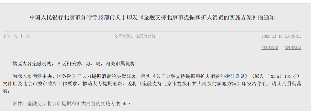 每经AI快讯,11月18日,中国人民银行北京市分行等12部门印发《金融支持北京市提振和扩大消费的 实施方案》。其中提出,加大债券市场融资支持力度。支持符合条件的文化、旅游、教育等服务消费领 域企业发行债券。鼓励符合条件的科创企业通过债券市场募集资金,推动智慧养老、智能医疗等消费产 品提质升级。支持辖内符合条件的消费金融公司、汽车金融公司、金融租赁公司发行金融债券,拓宽资 金来源,扩大消费信贷规模。推动个人汽车、消费、信用卡等零售类贷款资产证券化增量扩面,促进盘 活信贷存量,提升消费信贷供给能力。 ...