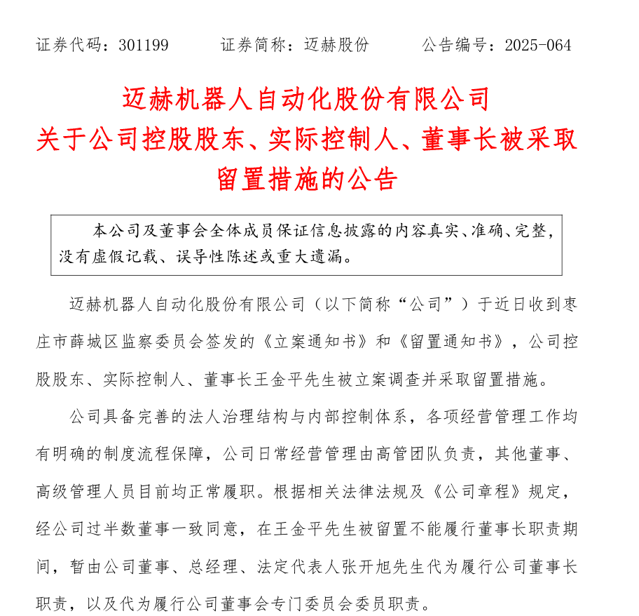公司现任董事、监事、高级管理人员专业背景、主要工作经历以及目前在公司的主要职责 证券简称:迈赫股份 证券代码:301199 公告编号:2025-064 迈赫机器人自动化股份有限公司 关于公司控股股东、实际控制人、董事长被采取 留置措施的公告 本公司及董事会全体成员保证信息披露的内容真实、准确、完整, 没有虚假记载、误导性陈述或重大遗漏。 迈赫机器人自动化股份有限公司(以下简称"公司")于近日收到枣 庄市薛城区监察委员会签发的《立案通知书》和《留置通知书》,公司控 股股东、实际控制人、董事长王金平先生被立案调查并采取留置措施。 公司具备完善的法人治理结构与内部控制体系,各项经营管理工作均 有明确的制度流程保障,公司日常经营管理由高管团队负责,其他董事、 高级管理人员目前均正常履职。根据相关法律法规及《公司章程》规定, 经公司过半数董事一致同意,在王金平先生被留置不能履行董事长职责期 间,暂由公司董事、总经理、法定代表人张开旭先生代为履行公司董事长 职责,以及代为履行公司董事会专门委员会委员职责。 在王金平被留置不能履行董事长职责期间,暂由公司董事、总经理、法定代表人张开旭代为履行公司董事长职责。公司日常经营管理 ...