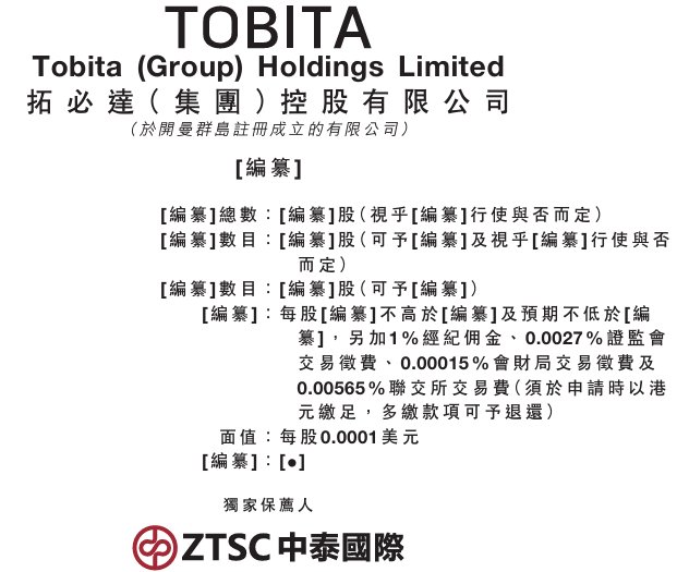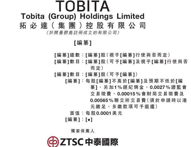 香港聯合交易所有限公司與證券及期貨事務監察委員會對本申請版本的內容概不負責,對其準確性或 完整性亦不發表任何意見,並明確表示概不就因本申請版本全部或任何部分內容而產生或因倚賴該等 內容而引致的任何損失承擔任何責任。 Tobita (Group) Holdings Limited 拓 必 達( 集 團 )控 股 有 限 公 司 (於開曼群島註冊成立的有限公司) 的申請版本 警告 本申請版本乃根據香港聯合交易所有限公司(「聯交所」)及證券及期貨事務監察委員會(「證監會」) 的要求而刊發,僅用作提供資訊予香港公眾人士。 本申請版本為草擬本,其內所載資料並不完整,亦可能會作出重大變動。 閣下閱覽本文件,即 代表 閣下知悉、接納並向拓必達(集團)控股有限公司(「本公司」)、其獨家保薦人、獨家整體協 調人、顧問或包銷團成員表示同意: 於本 公司 招股 章程 根據 香港 法例 第32 章公 司(清 盤及 雜項 條文)條例 送呈 香港 公司 註冊 處處 長登 記前,不會向香港公眾人士提出要約或邀請。倘在適當時候向香港公眾人士提出要約或邀請,有 意投資者務請僅依據於香港公司註冊處處長登記的本公司招股章程作出投資決定。該文件的文 ...