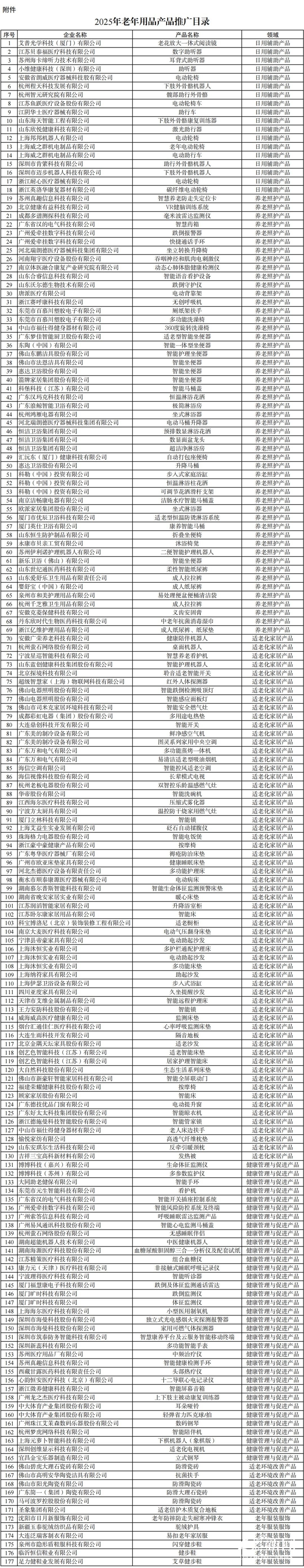 文章核心观点 - 工业和信息化部等五部门正式发布《2025年老年用品产品推广目录》,共有177项产品入选 [1][6] - 目录旨在满足全国老年用品生产企业和老年群体对产品智能化、健康化、品质化的需求 [6] - 入选产品将被择优推荐纳入中国消费名品名单,并鼓励地方将其纳入促消费补贴范围 [6] 产品入选概况 - 2025年推广目录共确定177项老年用品产品 [1] - 产品经由企业自愿申报、省级主管部门及行业组织推荐、专家评审、社会公示和征求部门意见等程序最终确定 [1] - 山东省有19项产品入选,包括山东海天智能工程有限公司的下肢外骨骼康复训练器、山东欣悦健康科技有限公司的激光助行器等 [1] 产品领域分布 - 日用辅助产品领域共有18项产品入选,代表性产品包括艾普光学科技的老花放大一体式阅读镜、江苏贝泰福医疗科技的数字助听器、多家公司的电动轮椅和外骨骼机器人等 [3] - 养老照护产品领域共有52项产品入选,涵盖智慧养老防走失定位卡、VR健脑训练系统、各类智能坐便器、沐浴椅、护理床及成人纸尿裤等产品 [3][4][5] - 适老化家居产品领域共有53项产品入选,包括健康陪伴机器人、智能跌倒检测吸顶灯、适老型家电、多功能护理床、智能锁及各类监测床垫等 [4][5] - 健康管理与促进产品领域共有37项产品入选,产品类型包括智能手环、多参数监护仪、中医健康机器人、血糖仪、心电记录仪及各类康复训练器材等 [5][6] - 适老环境改善产品领域共有6项产品入选,主要为佛山市多家公司生产的防滑陶瓷砖、抗菌扶手及适老倍护木质复合地板等 [6] - 老年服装服饰领域共有6项产品入选,包括老年防摔防走失耐寒冲锋衣、驼绒护具、易扣老年家居服及多款健步鞋等 [6]
