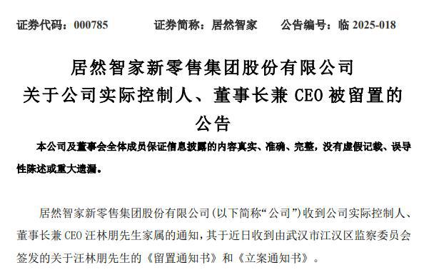 公司核心事件 - 公司实际控制人、董事长兼CEO汪林朋被采取留置措施并立案调查 公司表示已收到由武汉市江汉区监察委员会签发的《留置通知书》和《立案通知书》[1] - 公司强调控制权未发生变化 其他董事、监事和高管均正常履职 董事会运作正常 日常经营管理由高管团队负责 经营情况一切正常 预计该事项不会对日常经营活动产生重大影响[1] 实际控制人背景与持股情况 - 实际控制人汪林朋生于1968年 拥有硕士研究生学历 长期担任公司及关联集团的核心管理职务 包括北京居然之家投资控股集团有限公司董事长等[3] - 汪林朋合计持有公司41.26%的股份 以2024年4月17日公司总市值255.31亿元计算 其持有股票价值约105亿元[3] 公司业务与战略转型 - 公司原名“居然之家” 于2023年12月更名为“居然智家” 以反映其向智能家居体验中心转型升级的战略[5] - 公司成立于1999年 是以大家居为主业、大消费为平台的大型商业连锁集团 业务涵盖设计装修、家具建材销售、物流配送、家政服务、购物中心和生活超市等[5] - 更名旨在使公众更清晰地识别公司在智能家居产品和服务方面的专业性与创新性 推动商业模式转型升级 使名称与主营业务更匹配[5] 公司近期财务表现 - 根据2024年业绩快报 公司营业收入为129.66亿元 较上年同期下降4.04%[5] - 2024年归母净利润为8.83亿元 同比下降32.08% 扣非净利润为10.04亿元 同比下降18.37%[5] 行业环境与公司展望 - 公司认为 随着国家宏观经济政策向扩内需、促消费转变 以及国补、去库存、稳楼市等利好政策陆续出台 行业将迎来发展机遇[6] - 公司计划把握行业机遇 并利用自身在数智化转型方面的领先优势 以实现经营的稳定和经营业绩的提升[6]