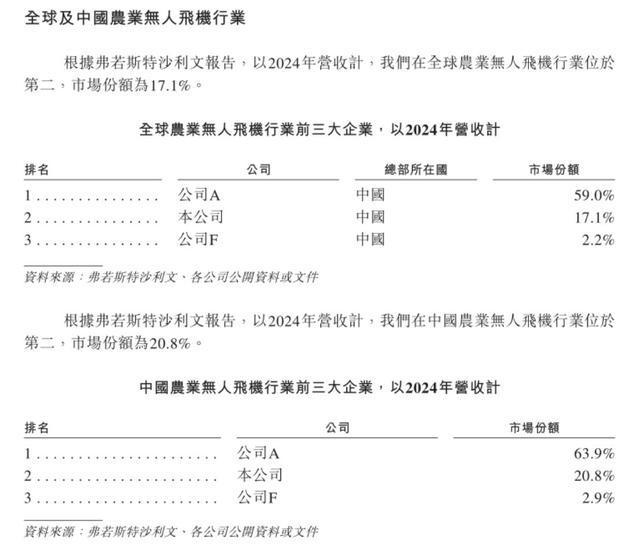 每经记者:吴泽鹏 每经编辑:魏文艺 近日,广州极飞科技股份有限公司(以下简称极飞科技)年度大会在广州召开,除了经销商、合作伙伴 与媒体,现场还专门设有投资机构席位。作为提交港股IPO申请后的首场公开秀,极飞科技此番动向引 人关注。 | 排名 | 公司 | 總部所在國 | 市場份額 | | --- | --- | --- | --- | | 1 . | 公司A | 中國 | Children Children 59.0% | | 2 . . | 本公司 | 中國 | 17.1% | | 3 . | 公司F | 中國 | 2.2% | | 排名 | 公司 | 市場份額 | | --- | --- | --- | | 1 | 公司A | 63.9% | | 2 | 本公司 | 20.8% | | CONSULTION CONSULTIO 3 | 公司F | 2.9% | 一个多月前,极飞科技正式向港交所递交上市申请,其在2024年实现扭亏为盈,今年上半年净利润超过 去年全年水平,达到1.34亿元(人民币,下同),公司主要产品为农业无人机。 极飞科技在招股书中表示,公司的目标是持续通过"机器人代人"的方式解决"无人种 ...