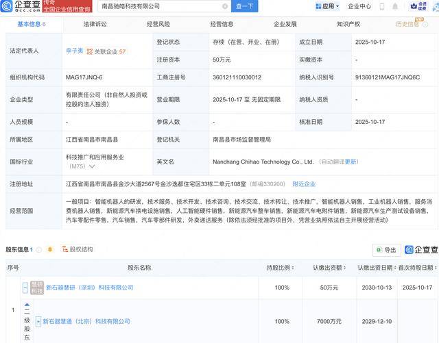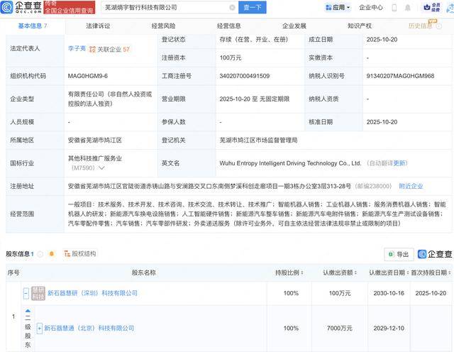 | 序号 | 殷东名称 | 持股比例 : | 认缴出资额: | 认缴出资日期:首次持股日期: | | --- | --- | --- | --- | --- | | 日日 | 新石器慧研(深圳)科技有限公司 | 100% | 100万元 | 2030-10-16 2025-10-20 | | 1 | | | | | | 服 东 | 级 + 新石器慧通(北京)科技有限公司 | 100% | 7000万元 | 2029-12-10 | 企查查APP显示,近日,芜湖熵宇智行科技有限公司成立,法定代表人为李子夷,经营范围包含:智能 机器人销售;工业机器人销售;服务消费机器人销售;智能机器人的研发;人工智能硬件销售等。企查 查股权穿透显示,该公司由新石器慧通(北京)科技有限公司间接全资持股。 | © 企章章 全国企业信用意海 | 英湖师宇智行科技有限公司 ○ 读一下 | | | | 国应用。企业中心 [ 人 山德 ( | | --- | --- | --- | --- | --- | --- | | 基本信息 7 | 法律诉讼 | 经营风险 | 企业发展 经营信息 | | 历史信息 知识产权 | | 法定代表人 | 李 ...