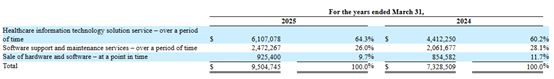 近年以来,伴随着大数据、人工智能等新兴技术的兴起,科技的发展正在深刻地、全方位地重塑现代医 院的面貌,使其从传统的"治病"场所,向"预防、诊疗、康复、健康管理"全生命周期服务的智慧中心转 变。 就医流程上,智慧服务、提升就医体验和医院运营的智能化,也使得医院由患者"排队拥挤"到"高效、 透明、人性化"。而在香港市场中,医疗系统亦积极拥抱数字化转型,其核心目标是提升医疗服务效 率、改善患者体验,并促进粤港澳大湾区的医疗协作。 同时,得益于医疗IT项目"高定制化+长周期+强粘性"的特点,公司单个HIS项目周期通常为1-3年,维护 服务合同期限长达2-10年,维护费占项目总价的10%-15%,2025财年维护服务收入占比已达26%,成为 营收的重要组成部分。 | | | For the years ended March 31. | | | | --- | --- | --- | --- | --- | | | 2025 | | 2024 | | | Healthcare information technology solution service - over a period | | | | | | of t ...