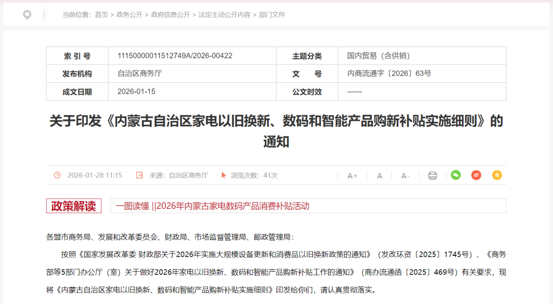 政策核心内容 - 内蒙古自治区于2026年1月15日印发细则,正式启动家电以旧换新、数码和智能产品购新补贴活动,政策自2026年1月1日起实施至年底 [3][4][5] - 政策旨在响应国家大规模设备更新和消费品以旧换新号召,发挥惠民生、促消费作用,并将发展经济的着力点放在实体经济上 [4][19] 补贴对象与品类 - 补贴对象为在内蒙古全区范围内购买补贴商品并取得销售发票的个人消费者 [6] - 补贴品类分为两大类:家电类包括冰箱(冰柜)、洗衣机(干衣机)、电视(投影仪)、空调(空气源热泵)、电脑、热水器(壁挂炉) [7] - 数码和智能产品类包括手机、平板、智能手表(手环)、智能眼镜 [8] 补贴标准与限额 - 家电类补贴标准为产品销售价格的15%,但仅限购买1级能效或水效标准的产品,2级能效及无能效标识产品不参与补贴 [9] - 家电类补贴每位消费者每类产品可补贴1件,每件补贴金额不超过1500元 [9] - 数码和智能产品类补贴标准同样为产品销售价格的15%,单件产品销售价格上限为6000元(含) [10] - 数码和智能产品每位消费者可补贴1件,每件补贴金额不超过500元 [10] - 2025年已享受某类家电补贴的消费者,2026年购买同类产品可继续享受补贴 [9] 补贴方式与流程 - 全区统一采用“补贴券”模式,通过中国银联内蒙古分公司提供的服务平台(云闪付App)运作 [11][12] - 消费者需下载云闪付App,在每日8:30-22:00领取当日有效的补贴券,通过专用终端或线上平台支付时直接抵扣补贴金额 [13] - 补贴资金采取“政策参与主体(即销售企业)先行垫付、政府审核后拨款”的方式 [12] - 政策参与主体需提交详细的交易资料供审核,包括消费者信息、产品信息、发票、带水印的照片等 [14] - 建立退货管理机制,若退货发生在财政补贴清算后,政策参与主体需在10日内退回相关补贴资金 [14] - 鼓励家电回收,消费者可通过“云闪付”内的“收旧小程序”登记信息,政策参与主体需具备送新收旧一站式服务能力 [15][20] 对行业与市场参与者的要求 - 政策参与主体的征集需公平对待线上线下、不同注册地、所有制和规模的企业,不得以销售额、垫资能力为由限制参与 [17] - 政策参与主体不得“先涨价后补贴”,需进行销售价格备案并公开承诺,在显著位置公示产品初始价、优惠、补贴及最终售价 [18] - 政策参与主体须严格执行发票制度,确保进项发票与所售商品对应,并向消费者开具实名发票,单张发票对应单件补贴商品 [18] - 鼓励金融机构加大对政策参与主体的信贷支持力度,以缓解其垫资压力 [22][37] 政策实施与监管重点 - 明确各部门职责:发改部门综合协调,商务部门组织实施与资金审核兑付,财政部门监管资金拨付,市场监管部门负责质量与价格监管,邮政管理部门负责配送环节管理 [16] - 要求提高补贴审核兑付效率,原则上每30天集中兑付一次,并可按照不超过政策参与主体已垫付补贴资金的70%进行预拨付 [19] - 通过数字化平台加强全流程资金监管,引入第三方审核,监测拦截虚假交易、一机多卖等异常订单 [21] - 加强寄递物流监管,重点监测同一收货地址短期内大量接收补贴产品等异常情况,防范虚假签收 [21] - 强化监督检查,对违规政策参与主体采取约谈、暂停资格、取消资格并追缴补贴等措施,涉嫌犯罪的将移交司法机关 [22]