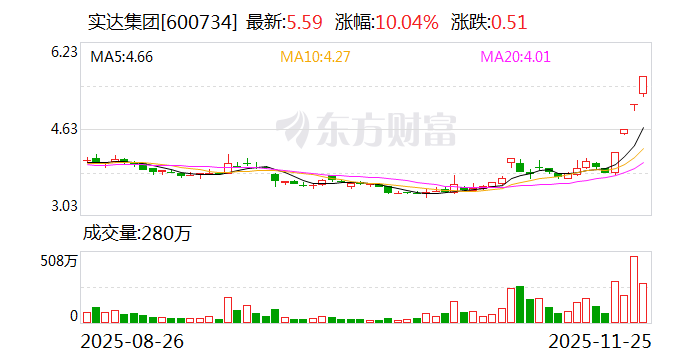 11月25日,实达集团(600734)开盘后快速拉升封住涨停,收报5.59元/股,公司股票连续4个交易日涨停。 | 显示停牌 | 到价提醒 | 等码 | | 实达集团 | | | +0.51 | | --- | --- | --- | --- | --- | --- | --- | --- | | 设置均线。 | | | | 600734 | | | +10.04% | | 025/3/27-2025/11/25(163根) | | | | F收市 CNY | | 10 | 日洗。 | | 1 11 | II | | | 委比 | 100.00% 三年 | | 61 24 | | | | | 5.59 | 卖五 | | O | | | 559 | | | | 卖叫 | | 0 | | | | | | | - | | 0 | | | | | | | | | 0 | | | | | | 4.84 | | | 0 | | | | | | | 本 | 5.59 | 593963 | | | | | | 4.41 | क्रे | 5.58 | 10653 | | | | | | | 河三 | 5.57 | 1894 ...