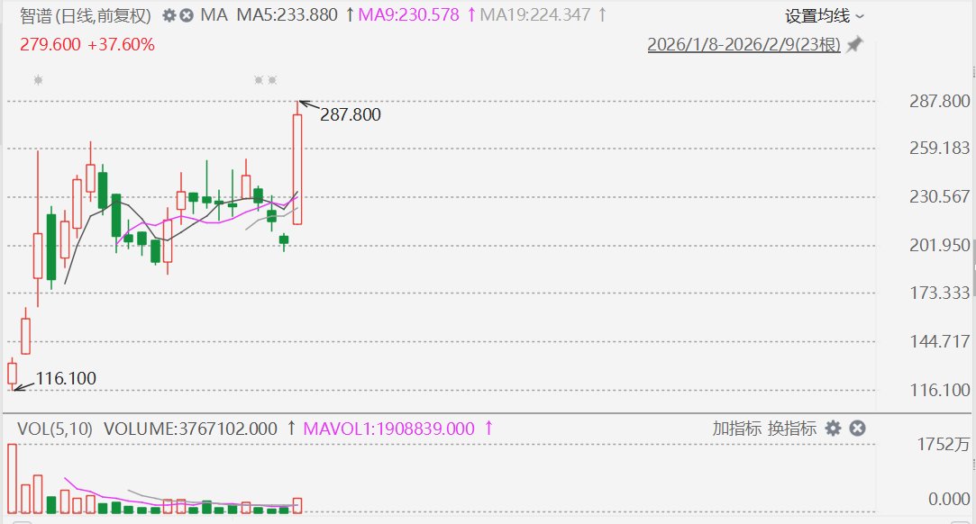 港股AI概念股市场表现 - 2月10日,港股市场AI概念股延续强势,再度集体走强 [1][5] - “全球大模型第一股”智谱在昨日收涨36%后,今日盘中再度大涨,截至发稿涨超16%,报321.6港元/股,此前一度涨超20% [1][5] - 智谱最新总市值达1434亿港元 [1][2] 智谱具体交易数据 - 截至2月10日10:55:40,智谱股价为321.600港元,成交额5.56亿港元,股本4.46亿股 [2] - 智谱换手率为0.81%,市净率数据未完整显示 [2] - 智谱盘口数据显示,卖一至卖十价格在321.600港元至323.400港元之间,买一价格为321.200港元 [2] 其他AI概念股表现 - 阜博集团涨近13%,现价5.160港元 [3][5][6] - 阅文集团涨超9%,现价41.280港元 [3][5][6] - MINIMAX-WP涨超5%,现价543.000港元 [3][5][6] - 万咖壹联涨10.77%,现价1.440港元 [3][6] - 迅策涨8.34%,现价65.600港元 [3][6] 潜在市场催化剂 - 近期,全球模型服务平台OpenRouter上架了一款名为“Pony Alpha”的神秘模型,迅速在24小时内登顶平台热度榜首 [4][6] - OpenRouter官方将“Pony Alpha”描述为“前沿基础模型”,在编程、智能体工作流、推理及角色扮演方面表现强劲 [4][6] - 行业基于“Pony”与马年的关系猜测,该款模型或为DeepSeek-V4或智谱GLM新模型 [4][6]