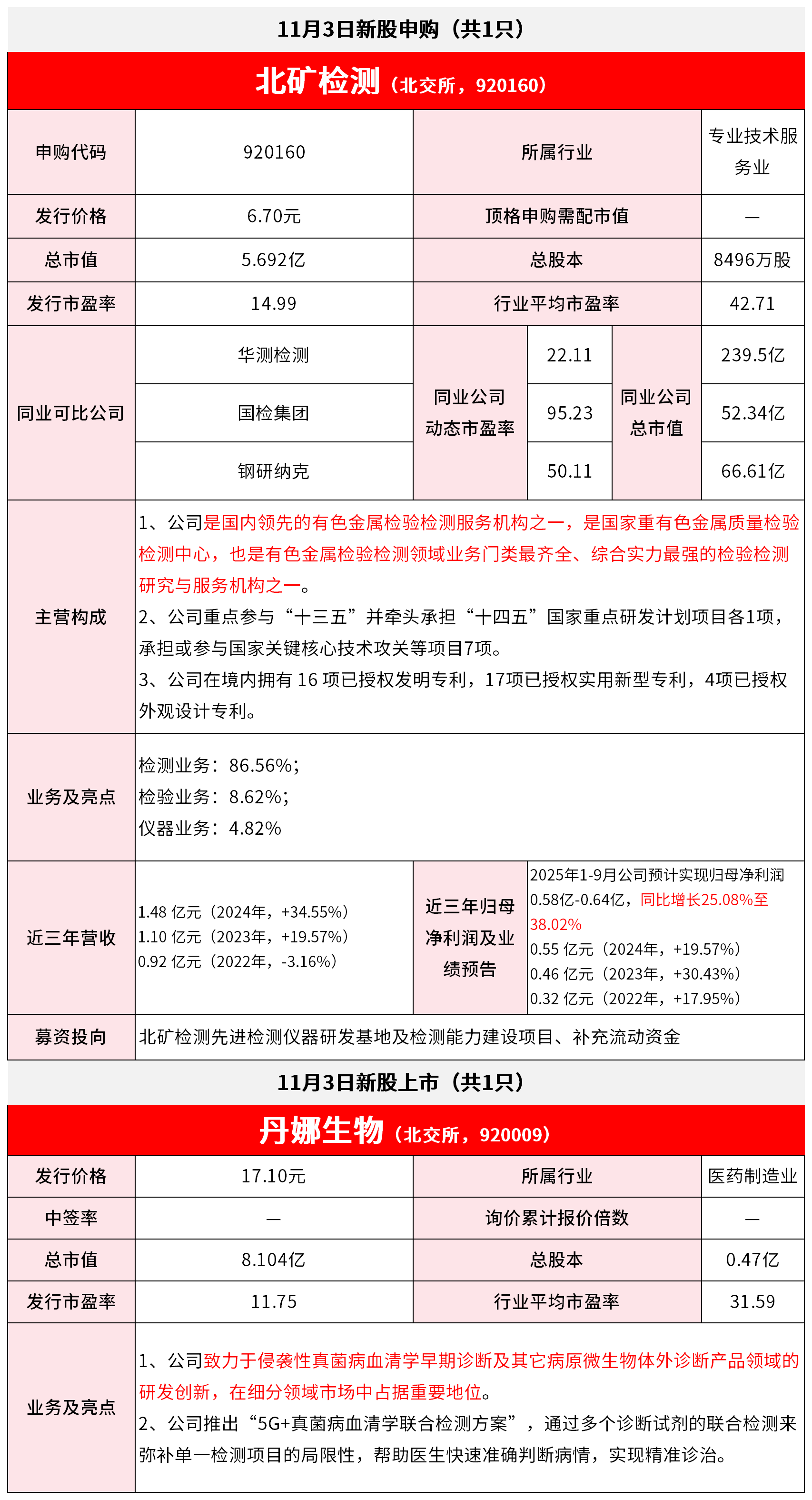 新股申购:北矿检测 - 公司于11月3日在北交所进行新股申购,申购代码为920160 [1][2] - 发行价格为6.70元,为顶格申购,发行市盈率为14.99倍 [2] - 公司总市值为5.692亿元 [2] 公司业务与市场地位 - 公司是国内领先的有色金属检验检测服务机构,也是该领域业务门类较全的研究与服务机构之一 [2] - 公司重点参与“十三五”并牵头承担“十四五”项目,承担或参与国家关键核心技术攻关等项目7项 [2] - 公司在境内拥有16项已授权发明专利和17项外观设计专利 [2] 财务表现 - 公司近三年归母净利润分别为:0.92亿元(2022年,-3.16%)、1.10亿元(2023年,+19.57%)、1.48亿元(2024年,+34.55%) [3] - 检测业务是公司核心收入来源,占主营构成的86.56%,检验业务和仪器业务分别占8.62%和4.82% [3] 募资用途与同业比较 - 本次募资投向为北矿检测先进检测仪器研发基地及检测能力建设 [3] - 同业可比公司包括华测检测、国检集团和钢研纳克 [2] 新股上市:丹娜生物 - 丹娜生物于11月3日在北交所上市 [3] - 发行价格为17.10元,总市值为8.104亿元,发行市盈率为11.75倍 [3] 丹娜生物业务亮点 - 公司致力于侵袭性真菌病血清学早期诊断及其研发创新,在细分领域市场中占据重要地位 [3] - 公司推出“5G+真菌病血清学联合检测方案”,以弥补单一检测项目的局限性,帮助医生快速准确诊断 [3]
