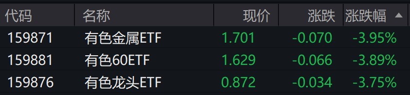 有色金属概念股早盘走低,北方稀土、洛阳钼业跌超5%,紫金矿业、华友钴业跌超4%。 受重仓股调整影响,有色金属相关ETF跌近4%。 | 代码 | 名称 | 现价 | 涨跌 涨跌幅 ▲ | | --- | --- | --- | --- | | 159871 | 有色金属ETF | 1.701 | -0.070 -3.95% | | 159881 | 有色60ETF | 1.629 | -0.066 -3.89% | | 159876 | 有色龙头ETF | 0.872 | -0.034 -3.75% | 有券商表示,2025年,有色金属板块市场波动风险仍高,需求端、供应端扰动等因素均带来不确定性。然而,新兴需求 在铜、铝下游结构中的占比已从量变走向质变,有望支撑有色金属长期价格中枢向上抬升。 (文章来源:每日经济新闻) ...