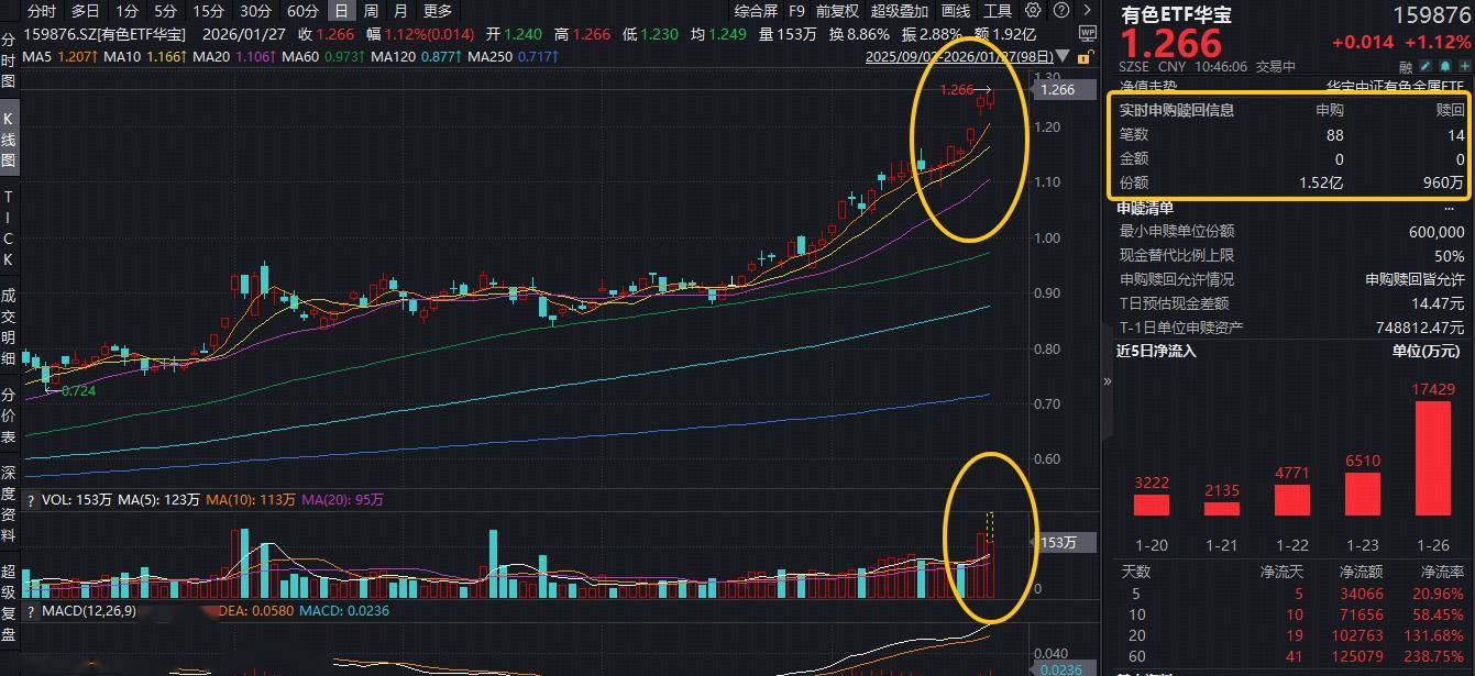洛阳钼业完成巴西金矿收购!有色ETF华宝(159876)猛拉5%,量价齐创历史新高!获资金净申购超1.2亿份!