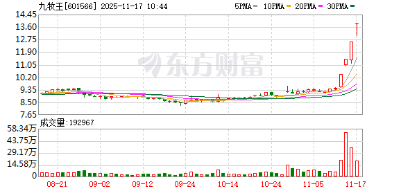 九牧王盘中涨停,已连收4个涨停板,截至9:25,该股报13.84元,换手率0.27%,成交量156.45万股,成 交金额2165.27万元,涨停板封单金额为1.17亿元。连续涨停期间,该股累计上涨46.46%,累计换手率 为19.39%。最新A股总市值达79.53亿元。 证券时报·数据宝统计,两融数据来看,该股最新(11月14日)两融余额为1.68亿元,其中,融资余额 1.68亿元,较前一个交易日增加3500.26万元,环比增长26.37%,近4日累计增加5211.60万元,环比增长 45.07%。 龙虎榜数据显示,该股因连续三个交易日内,涨幅偏离值累计达20%、日涨幅偏离值达7%上榜龙虎榜1 次,买卖居前营业部中,机构净卖出1560.00万元,沪股通累计净卖出2512.84万元,营业部席位合计净 买入1172.94万元。 公司发布的三季报数据显示,前三季公司共实现营业收入21.30亿元,同比下降6.02%,实现净利润3.10 亿元,同比增长129.63%,基本每股收益为0.5400元,加权平均净资产收益率7.71%。 据天眼查APP显示,九牧王股份有限公司成立于2004年03月11日,注册资本57463.7 ...