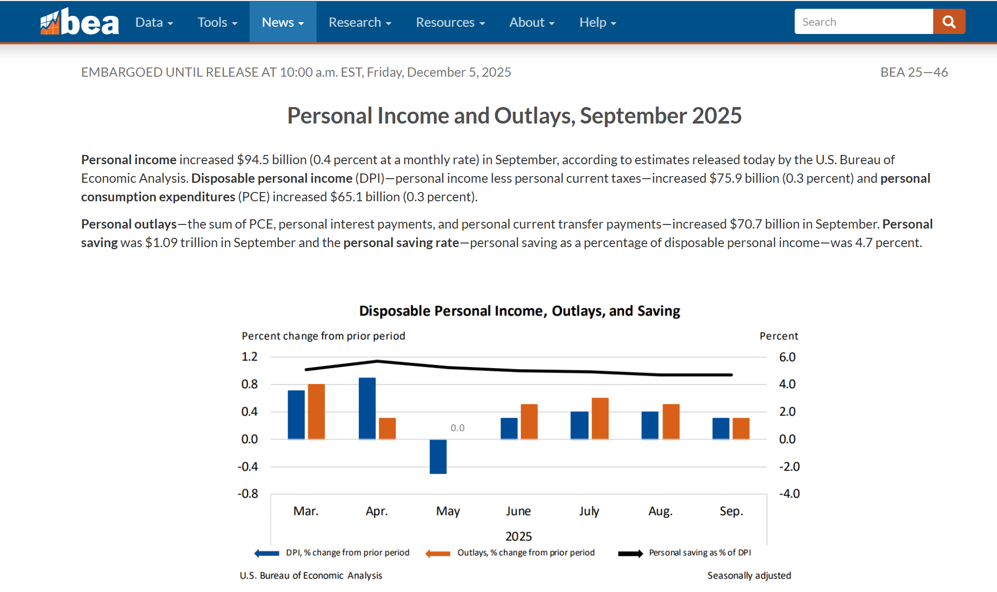 美国9月通胀数据 - 美国9月个人消费支出物价指数同比上升2.8%,环比上升0.3%,均符合市场预期[5] - 剔除食品和能源的核心PCE同比上升2.8%,略低于市场预期,且低于8月的2.9%[5] - 分项数据显示,商品价格上涨0.5%,服务价格上涨0.2%,食品价格上涨0.4%,能源价格上涨1.7%[5] 通胀数据对货币政策的影响 - 核心PCE是美联储衡量长期通胀趋势的主要政策工具,其低于预期的表现有利于支持降息[5] - 该数据为下周美联储议息会议提供了关键参考[5] 美国个人消费支出状况 - 剔除价格变动后的“真实”个人消费支出在9月增长陷入停滞[5] - 商品支出出现自5月以来的最大降幅,其中汽车及零部件、服装和鞋类支出下降[6] - 此趋势与9月零售数据相匹配,显示电子产品、服装和体育用品等品类出现实质性下降[6] 美国个人收入状况 - 美国消费者的实际可支配收入连续第二个月几乎没有增长[6] - 工资和薪金收入上涨0.4%,而资产收入有所回升[6] 数据发布背景 - 该报告原定于10月31日发布,因美国政府停摆影响推迟至12月6日[5] - 10月及以后的通胀情况需等待12月18日发布的11月CPI数据[5]