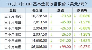 金属多飘绿 期铜下跌,受累于宏观担忧和美元上涨 【11月17日LME收盘】