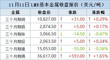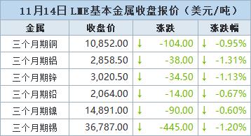 LME期铜收涨108美元,报10962美元/吨。LME期铝收跌4美元,报2859美元/吨。LME期锌收涨8美元,报3026美