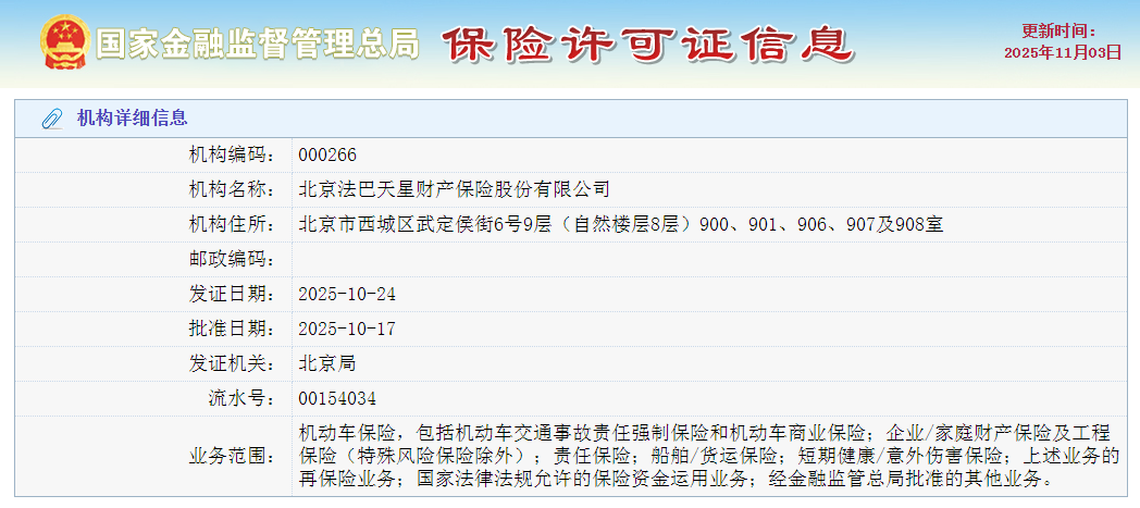 经过一年紧锣密鼓的筹建工作,北京法巴天星财产保险股份有限公司(以下简称"法巴天星保险")已获北京金融监管局颁发的保险许可证。 人事方面,从此前披露的信息来看,法巴天星保险拟任董事长为黄譎葹(OOI See See)。公开资料显示,黄譎葹生于1968年,毕业于美国爱荷华大学,拥 有精算学士学位,曾任中意多渠道营销部负责人、意大利忠意集团亚洲区办事处(香港)亚洲区分销部负责人、法国巴黎保险集团亚洲区总部(香港)亚洲 区副总裁、法国巴黎保险集团亚洲区总部(香港)亚洲区总裁等职位,现任法国巴黎保险集团中国区非执行主席、亚洲区总部(香港)亚洲区总裁。 国家金融监督管理总局保险许可证查询页面显示,法巴天星保险的机构编码为000266,发证日期为2025年10月24日,批准日期为2025年10月17日。 《每日经济新闻》记者(以下简称"每经记者")注意到,早在2025金融街论坛年会期间(10月27日至30日),就有活动议程公布要举办法巴天星保险的揭幕 仪式,但最后该仪式并未举行。不过,从批复内容来看,彼时法巴天星保险已经拿到了开业许可证。 | 机构详细信息 | | | --- | --- | | 机构编码: | 00026 ...