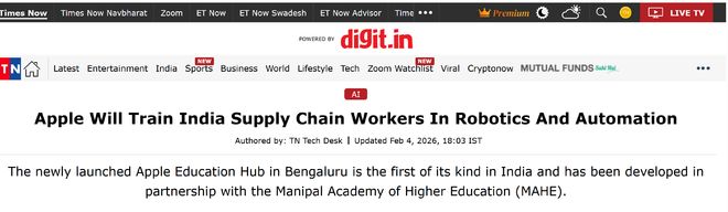 公司战略与投资 - 苹果公司在印度班加罗尔设立首个教育中心,将于今年3月正式开课,由苹果公司与马尼帕尔高等教育学院合作运营 [1] - 苹果计划在印度全国25家以上供应商厂区升级技能培养课程,塔塔电子将率先推行新版课程 [2] - 相关培训项目资金均来自苹果全球5000万美元供应商员工发展基金,该基金专门用于支持全球供应链内的教育与技能培训工作 [2] 具体举措与课程内容 - 班加罗尔教育中心首期课程聚焦数字素养与Swift编程语言教学,作为印度供应商员工的集中式培训与协调核心机构 [1] - 供应商厂区升级课程内容涵盖数字素养、Swift编程、机器人技术、自动化技术及智能制造实践等关键领域 [2] - 苹果已为印度供应商员工开设超75项培训课程,覆盖技术技能、职业发展、健康教育及权益认知等多个维度 [2] - 苹果将规模化推广2024年12月在印度启动的机器人教育项目,通过专用机器人实验室培训工厂讲师,计划今年晚些时候覆盖更多供应商厂区 [2]