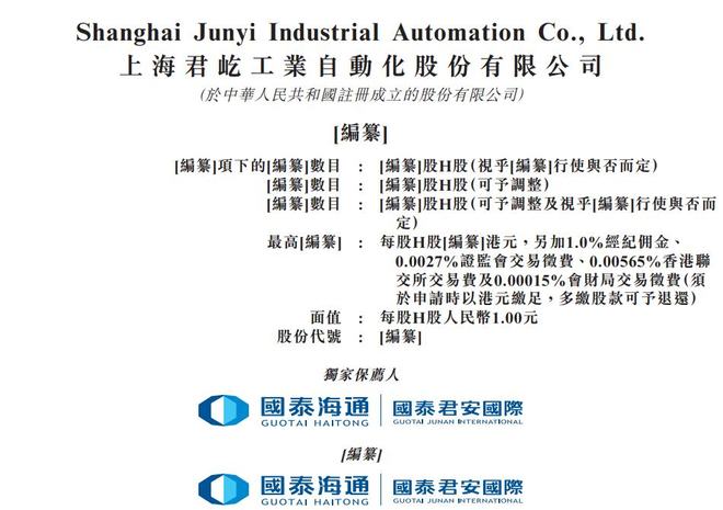 公司上市申请 - 上海君屹工业自动化股份有限公司于2024年1月23日向港交所主板递交上市申请书,独家保荐人为国泰海通国际 [1] 公司业务定位 - 公司是中国内地机器人自动化系统及解决方案的知名集成商 [1] - 公司致力于为全球汽车制造及新能源电池产业提供智能制造解决方案 [1] - 公司凭借深厚的产业制程专业知识、丰富的经验、卓越的往绩记录与强大的技术整合能力,已成为世界级机器人技术与终端用户工业应用之间的关键纽带 [1] 发行股份信息 - 本次发行涉及H股,每股面值为人民币1.00元 [2] - 发行价格最高为每股H股[编纂]港元,另需加计1.0%经纪佣金、0.0027%证监会交易征费、0.00565%香港联交所交易费及0.00015%财汇局交易征费,申请时需以港元足额缴纳,多缴股款可退还 [2]