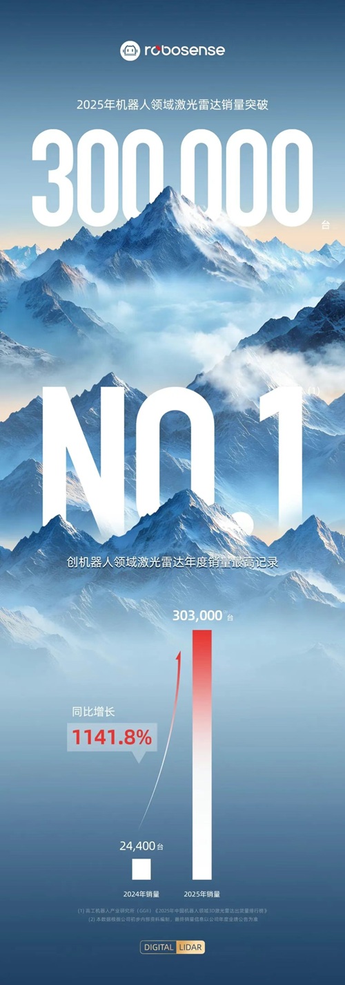 1月13日,RoboSense速腾聚创正式官宣重磅业绩:2025年公司机器人领域激光雷达产品销量强势突 破30.3万台,成功登顶行业销量冠军宝座。相较于2024年,该业务板块销量同比暴涨1141.8%,以千倍 级增速彰显出在机器人激光雷达赛道的绝对竞争优势。 这一业绩表现已得到权威机构佐证。高工机器人产业研究所(GGII)发布的《2025年中国机器人 领域3D激光雷达出货量排行榜》明确显示,RoboSense速腾聚创2025年机器人领域激光雷达年出货量稳 居行业首位,成为该细分市场的领军者。与此同时,GGII对行业前景作出乐观预判:在割草机器人、 人形/四足机器人等新兴应用场景的持续拉动下,3D激光雷达市场将迈入高速增长通道,预计到2030年 市场规模将逼近45亿元,2025-2030年期间复合增长率高达35.52%,行业成长空间广阔。 亮眼业绩的背后,是RoboSense速腾聚创对技术创新的坚守与对市场机遇的精准把握。2025年全球 机器人产业迎来爆发式增长,速腾聚创凭借全栈自研芯片构筑的高性能数字化产品实力,在智能割草机 器人、无人配送机器人、人形机器人等多个核心应用领域实现"多点开花",成功锁定行业头部 ...